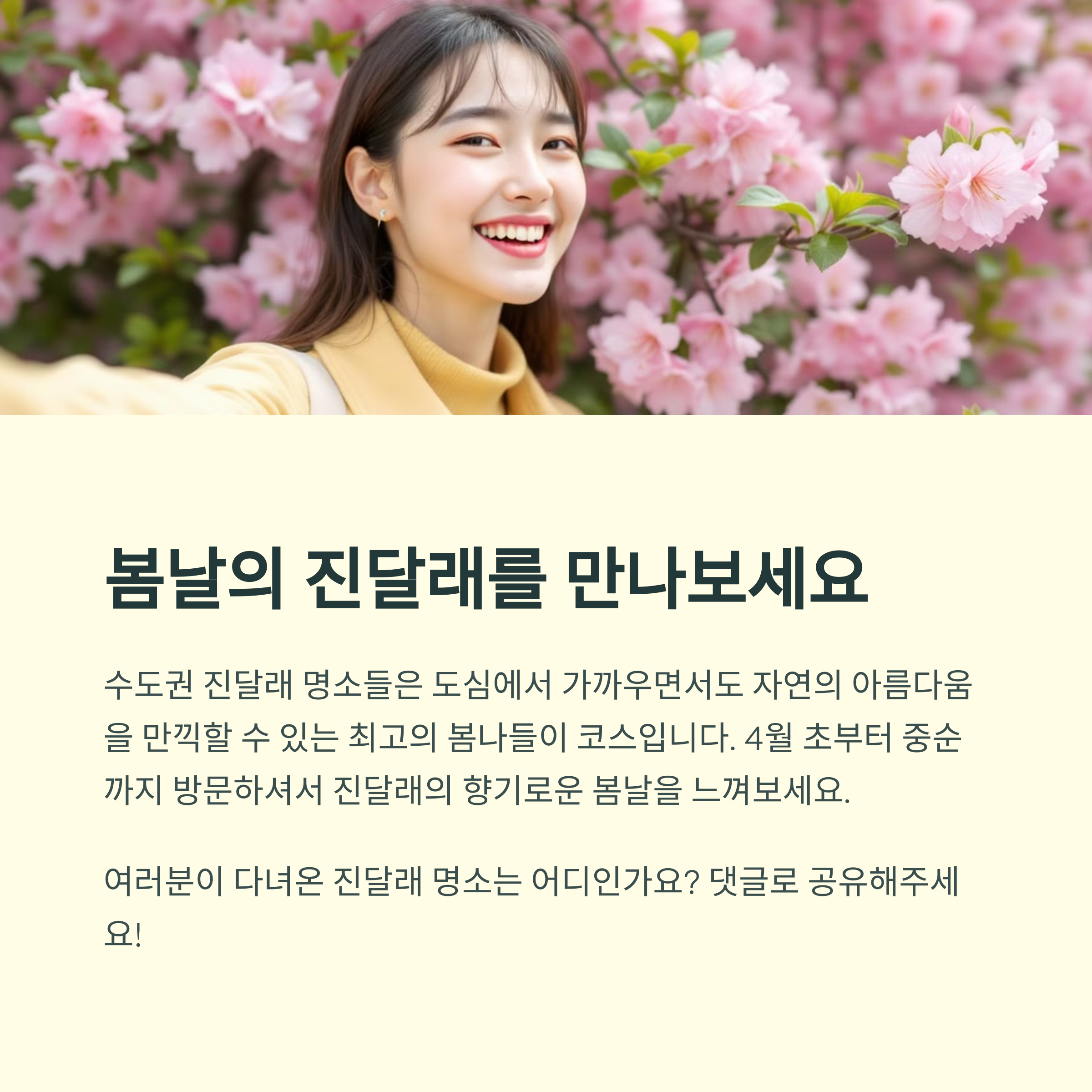 진달래가 만개한 산책로를 걷거나 아름다운 풍경 속에서 사진 촬영을 하는 등 이번 봄에는 자연 속에서 힐링해보세요.