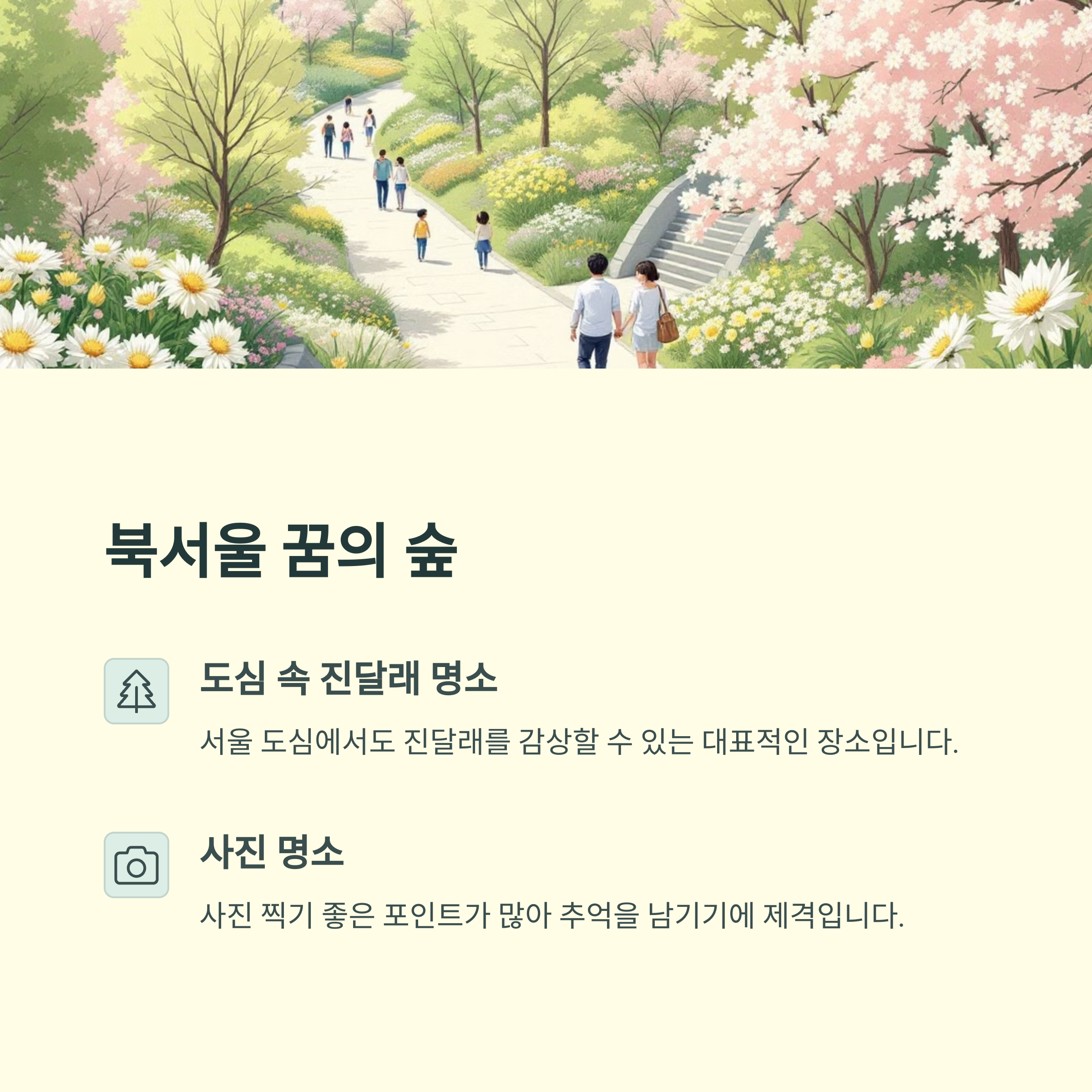 북서울 꿈의 숲은 서울 도심 속에서도 진달래를 감상할 수 있는 대표적인 명소입니다. 산책로와 자연 경관이 잘 어우러져 남녀노소 누구나 편하게 방문할 수 있습니다. 특히 다양한 봄꽃과 함께 진달래를 감상하며 힐링하기 좋은 장소로 추천드립니다. 사진 찍기 좋은 포인트도 많아 추억을 남기기에도 제격입니다.