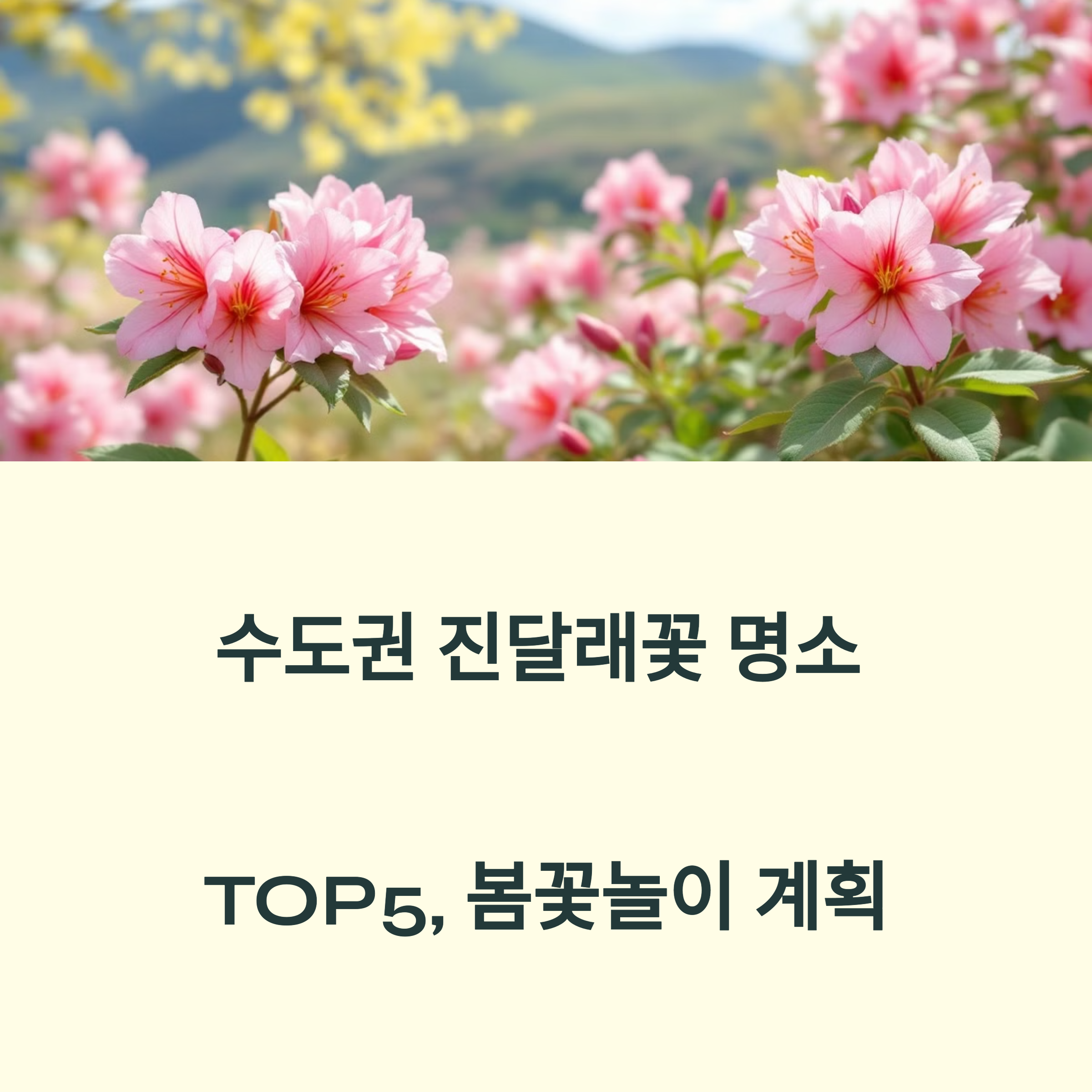 오늘은 수도권에서 진달래꽃을 즐기기에 가장 좋은 TOP5 명소를 소개해드리겠습니다. 각 명소의 위치와 특징, 추천 방문 시기까지 꼼꼼하게 알려드리니 끝까지 읽어보시고 봄꽃놀이 계획에 참고해보시길 바랍니다.