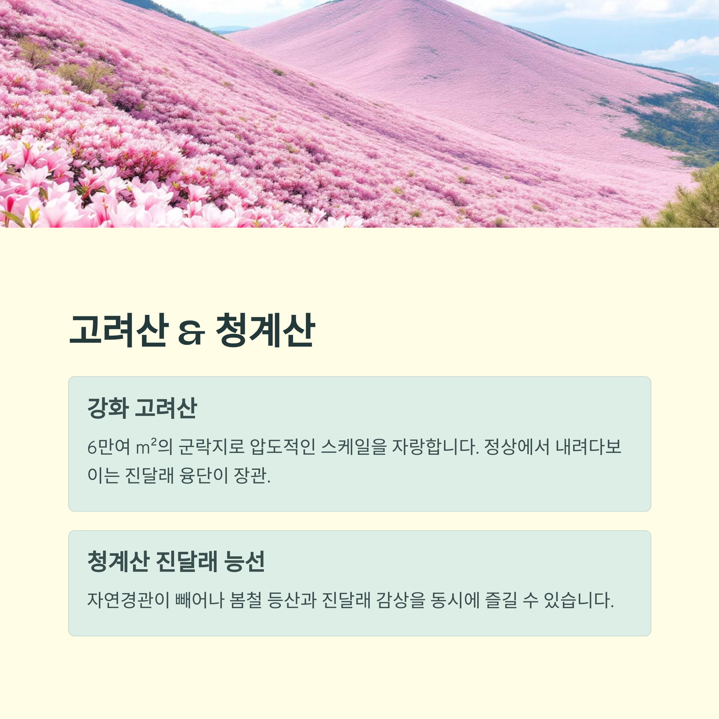 강화 고려산 진달래는 6만여 m²의 군락지로 압도적인 스케일을 자랑합니다. 해발 436m 정상까지 오르는 길은 등산객들에게 도전이 되지만 정상에서 내려다보이는 진달래 융단은 힘든 길을 잊게 만들 정도로 아름답습니다. 청계산 진달래 능선 또한 자연경관이 빼어나 봄철 등산과 진달래 감상을 동시에 즐길 수 있어 많은 이들의 사랑을 받습니다.