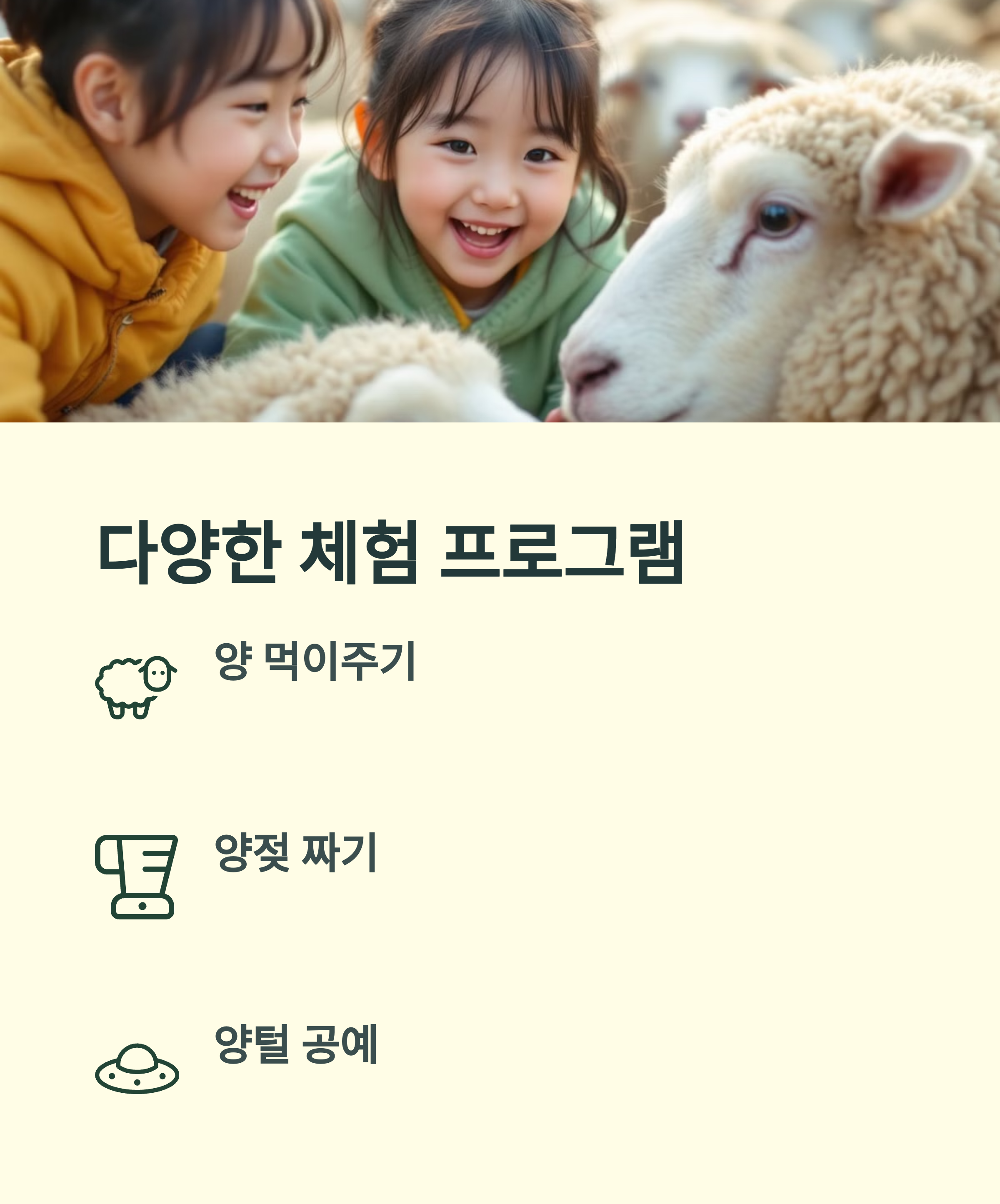 | 주요 체험 | 양 먹이주기, 양젖 짜기, 양털 공예 등 다양한 체험이 제공됩니다. |