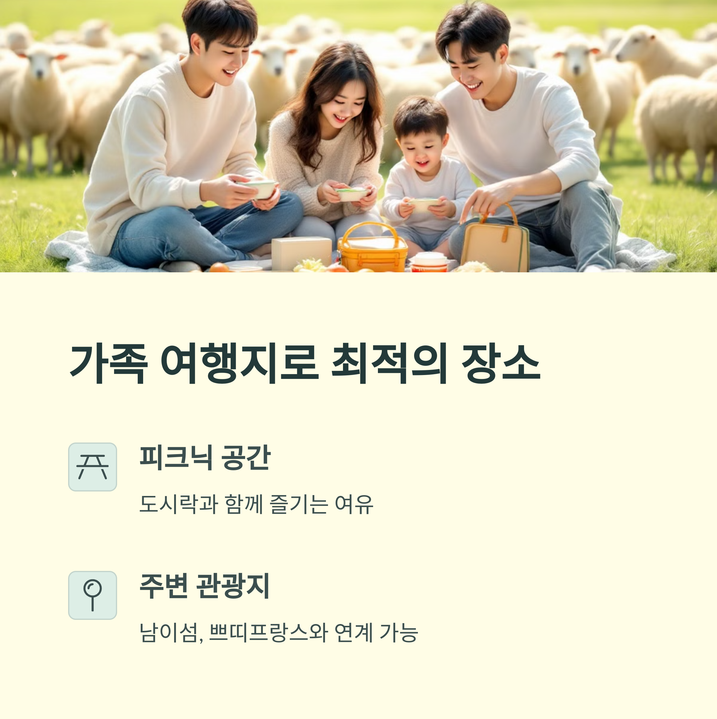 가평 양떼목장은 가족 단위 방문객에게 최적의 장소로, 어린이들이 자연 속에서 마음껏 뛰어놀며 건강하게 성장할 수 있고, 어른들은 여유롭게 풍경을 즐기며 힐링할 수 있습니다. 피크닉 공간이 마련되어 있어 도시락을 준비해 즐거운 점심 시간을 보낼 수 있는 것도 큰 장점입니다. 주변 관광지인 남이섬, 쁘띠프랑스, 아침고요수목원 등과의 연계 방문도 용이해 당일치기 또는 1박 2일 가족 여행지로 인기가 높습니다.