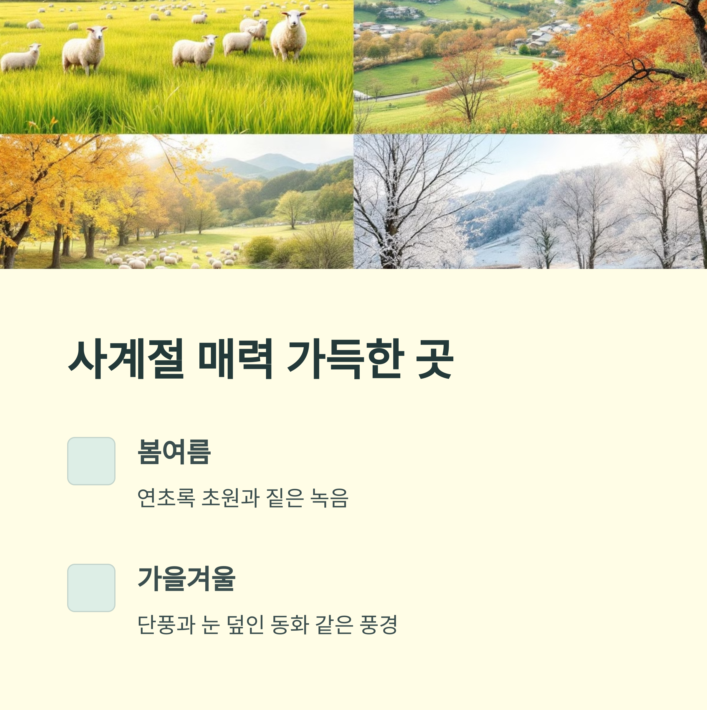 가평 양떼목장은 사계절 내내 다양한 자연의 매력을 느낄 수 있는 공간입니다. 봄에는 연초록빛 초원이 펼쳐지고, 여름에는 짙은 녹음이 시원함을 전합니다. 가을에는 형형색색 단풍이 양들과 어우러져 그림 같은 풍경을 선사하며, 겨울에는 새하얀 눈밭 위를 거니는 양들의 모습이 동화 같은 장면을 만들어냅니다. 이처럼 매 시즌마다 새로운 모습을 보여주는 가평 양떼목장은 방문할 때마다 색다른 감동을 느낄 수 있어 많은 이들의 발길을 끌고 있습니다.