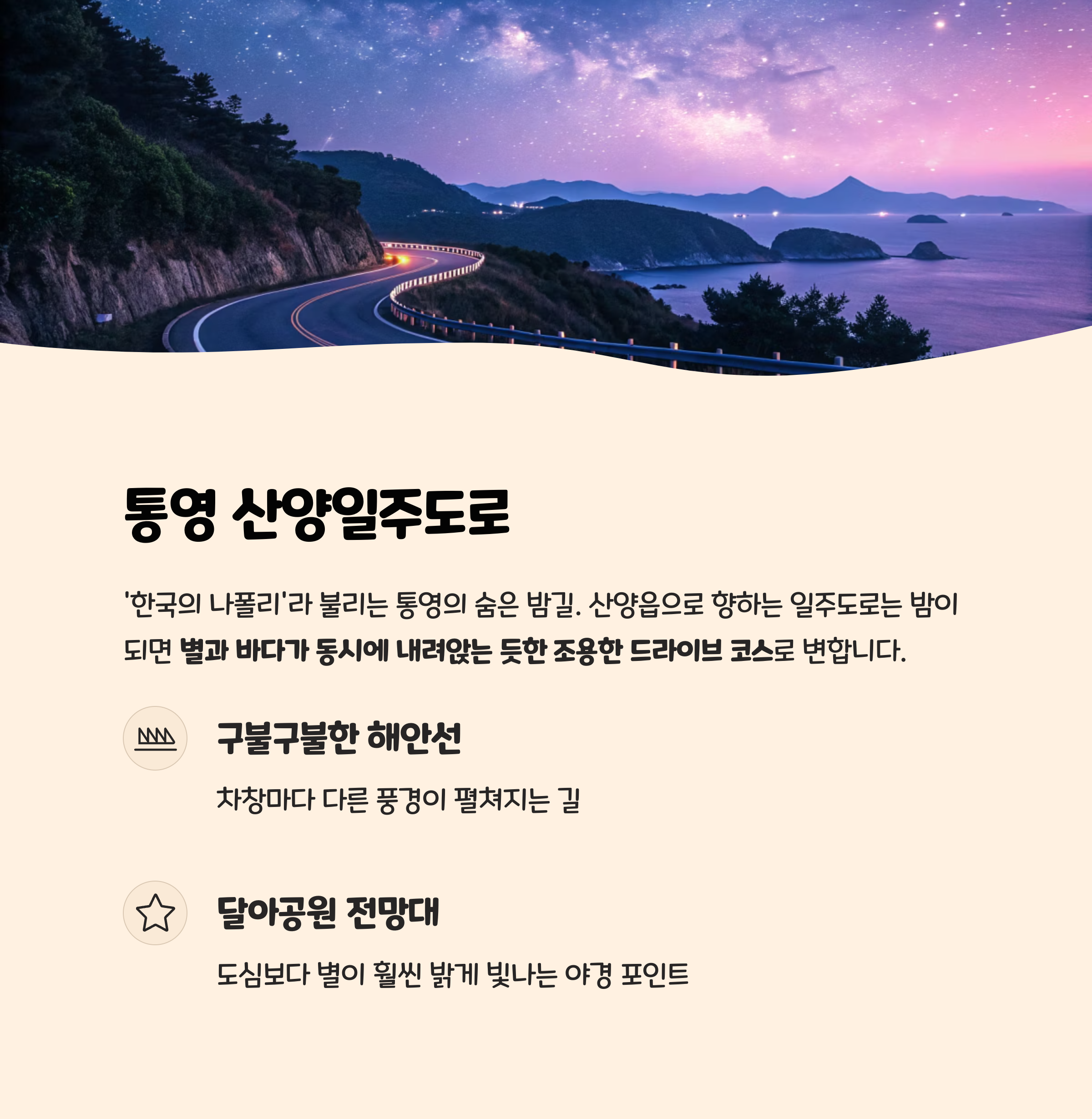 | 통영 | 산양일주도로 | 달아공원 별빛 전망 |