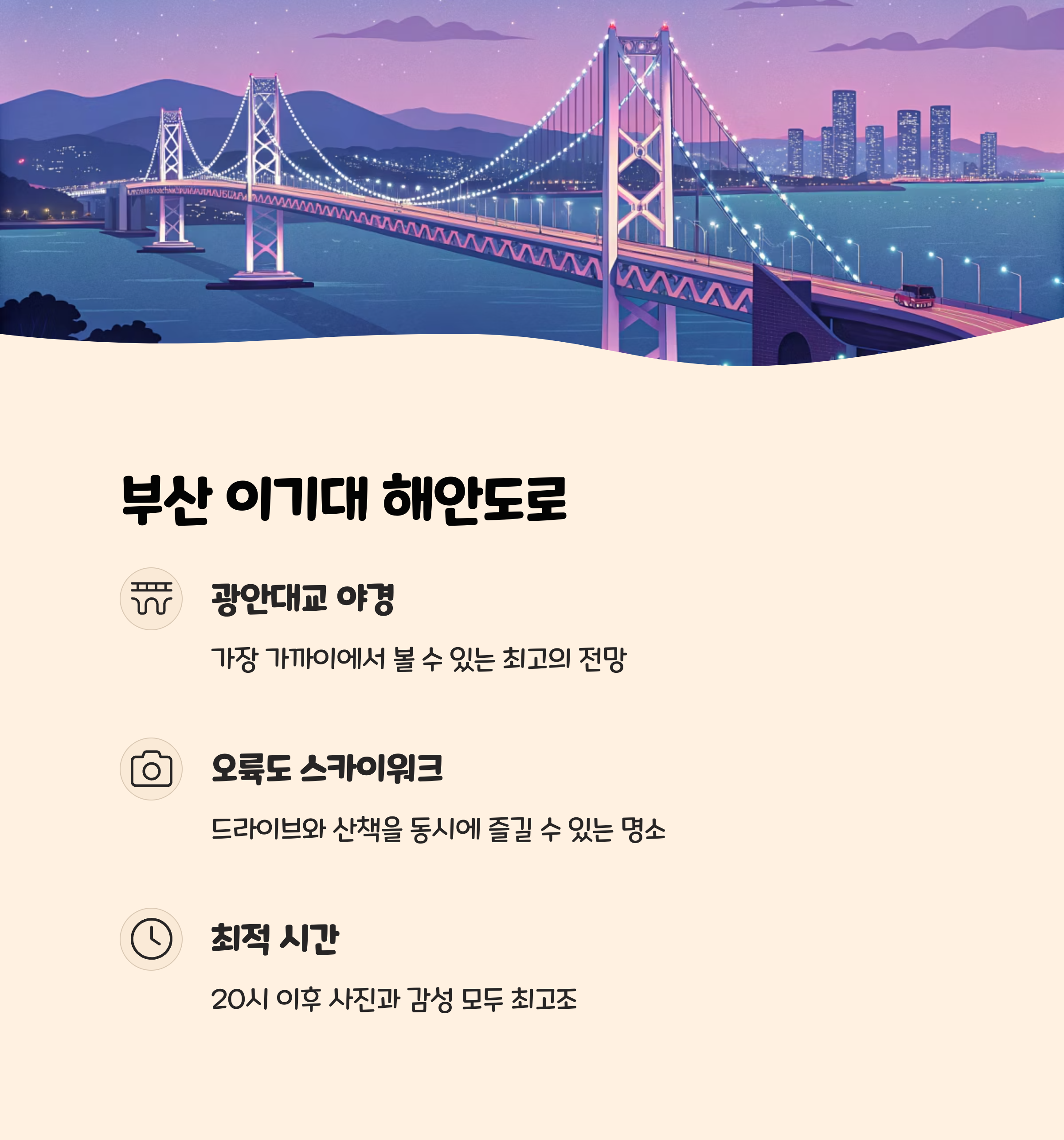 야경 명소인 오륙도 스카이워크를 포함해 드라이브와 산책을 동시에 즐길 수 있습니다.