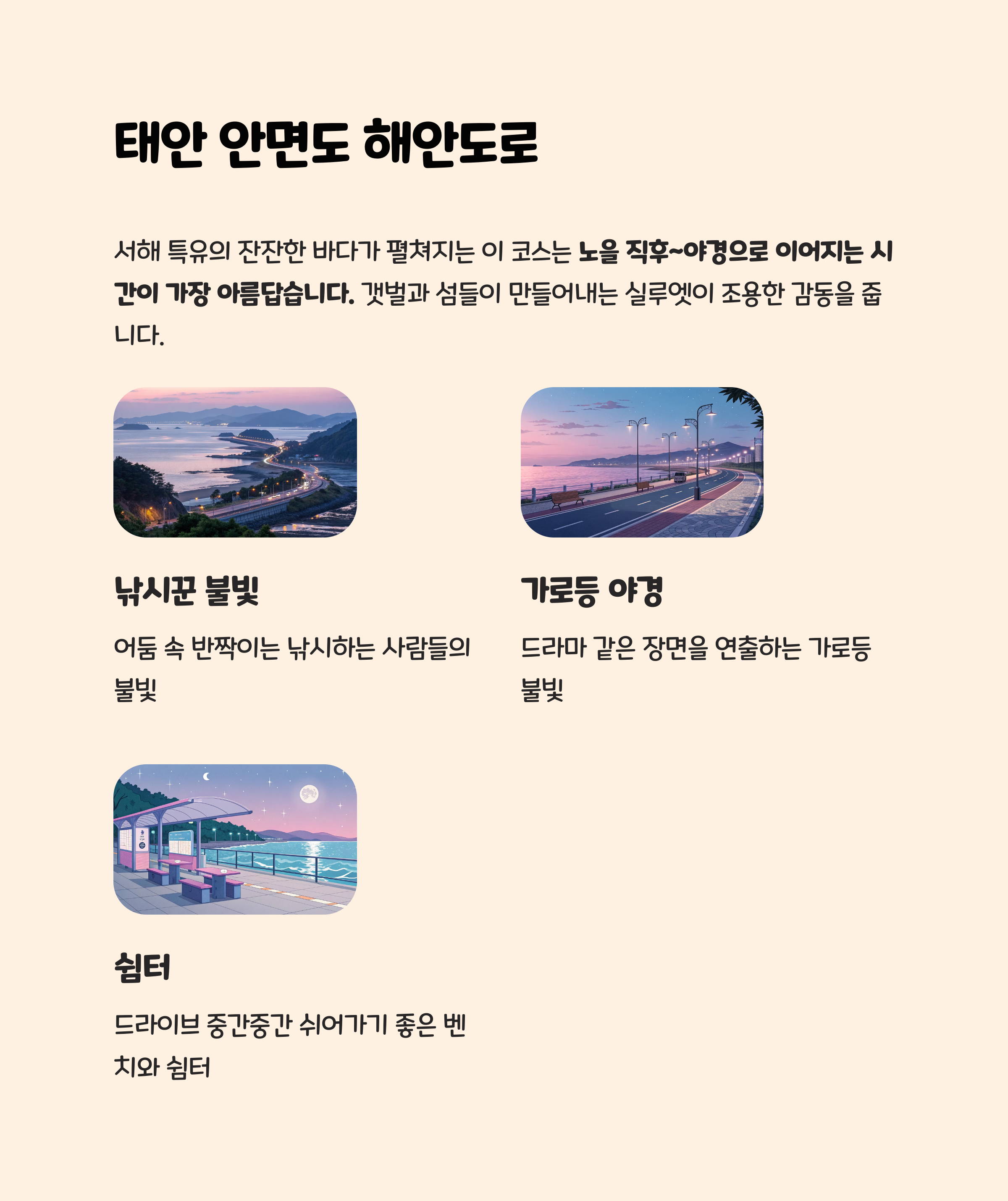 밤이 되면 별과 바다가 동시에 내려앉는 듯한 조용한 드라이브 코스로 변합니다.