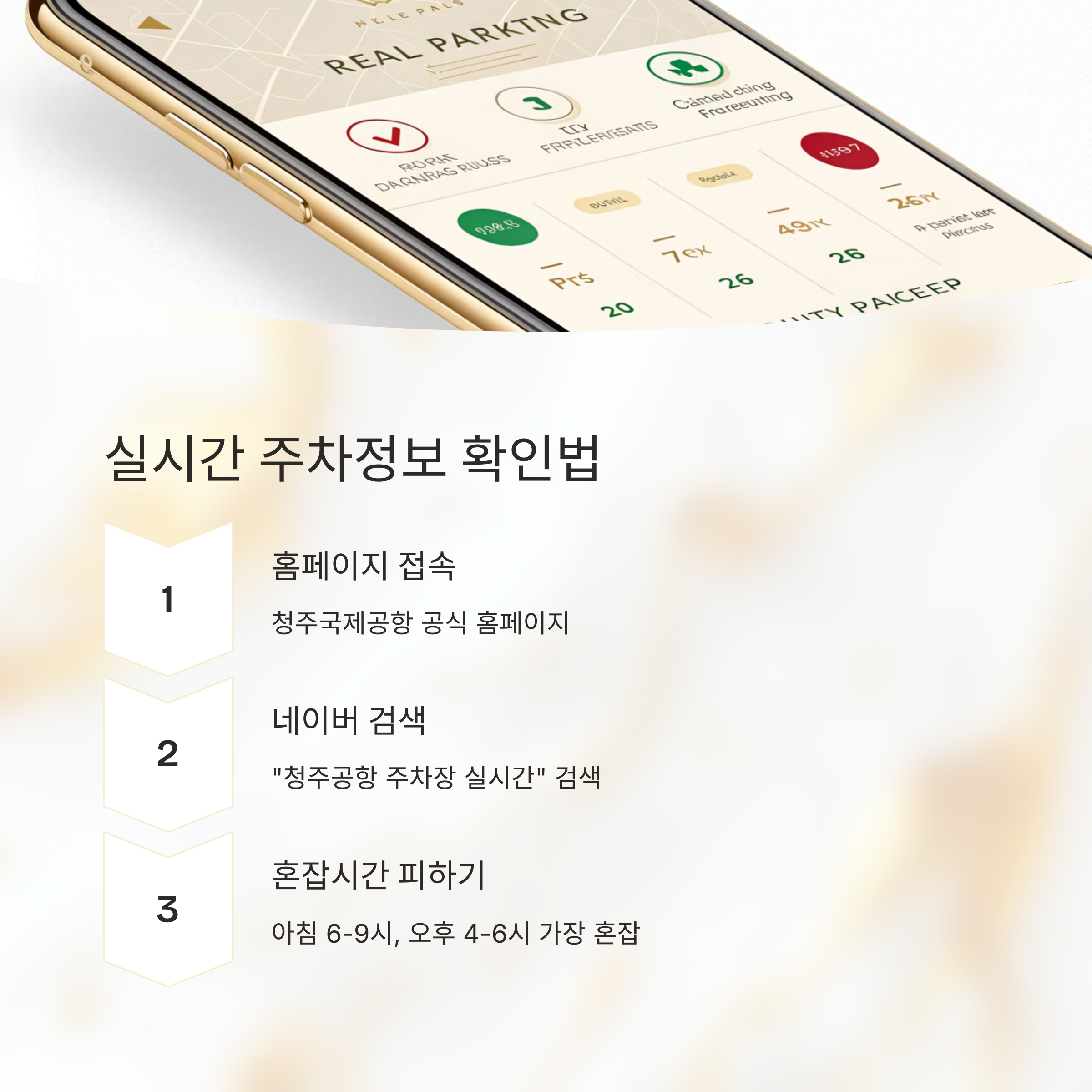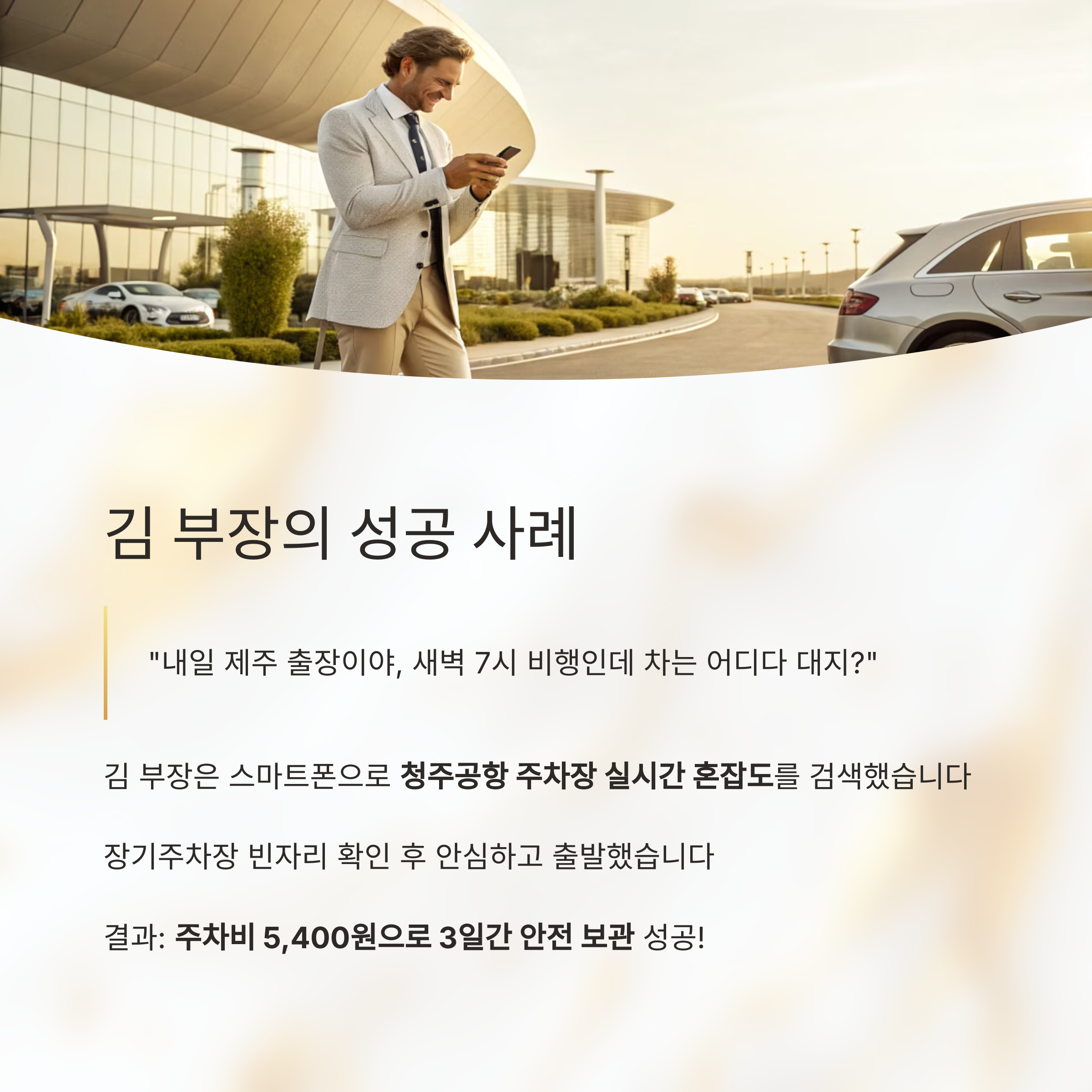 김 부장은 스마트폰을 꺼내 청주공항 주차장 실시간 혼잡도를 검색합니다