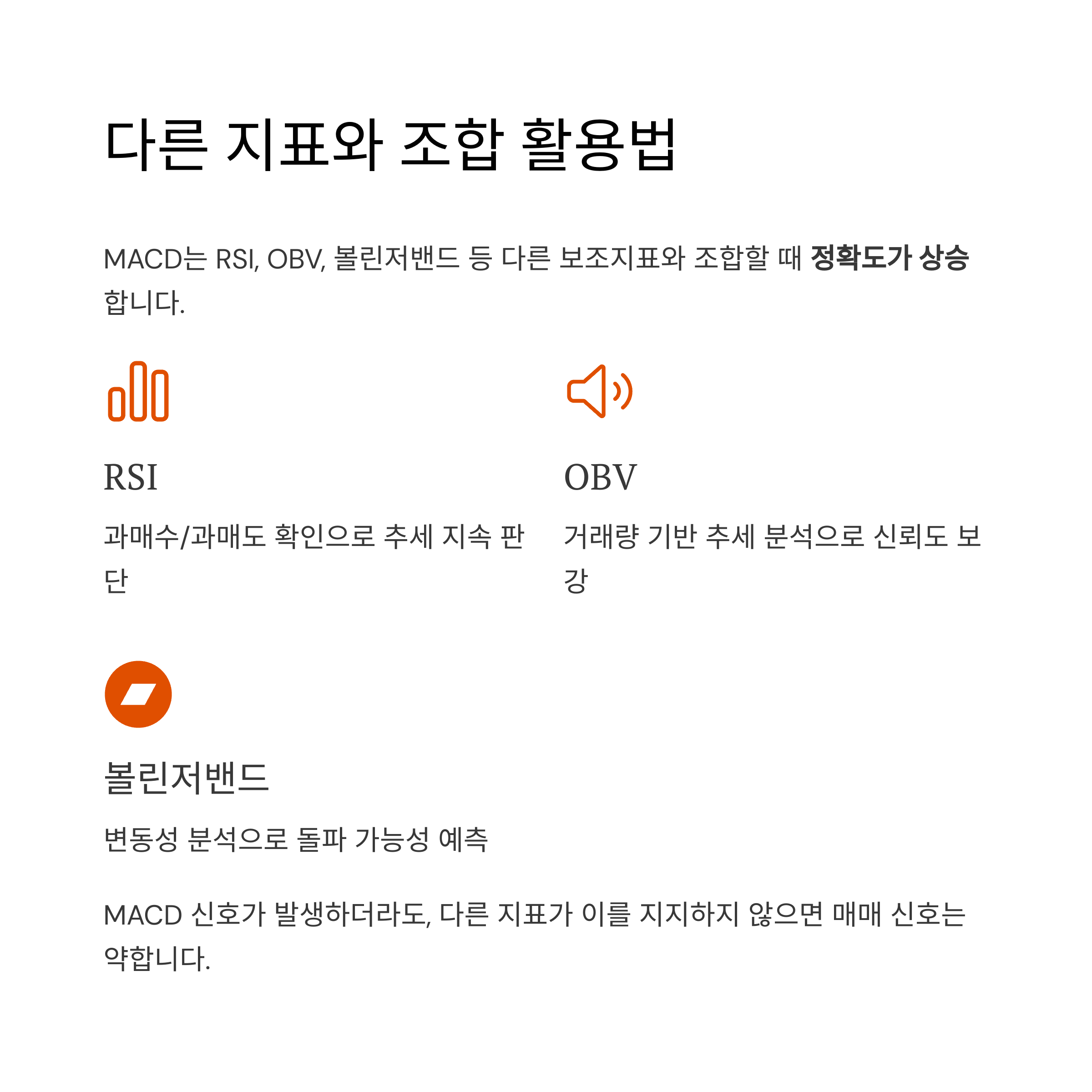 | RSI | 과매수/과매도 확인 | 추세 지속 판단 |