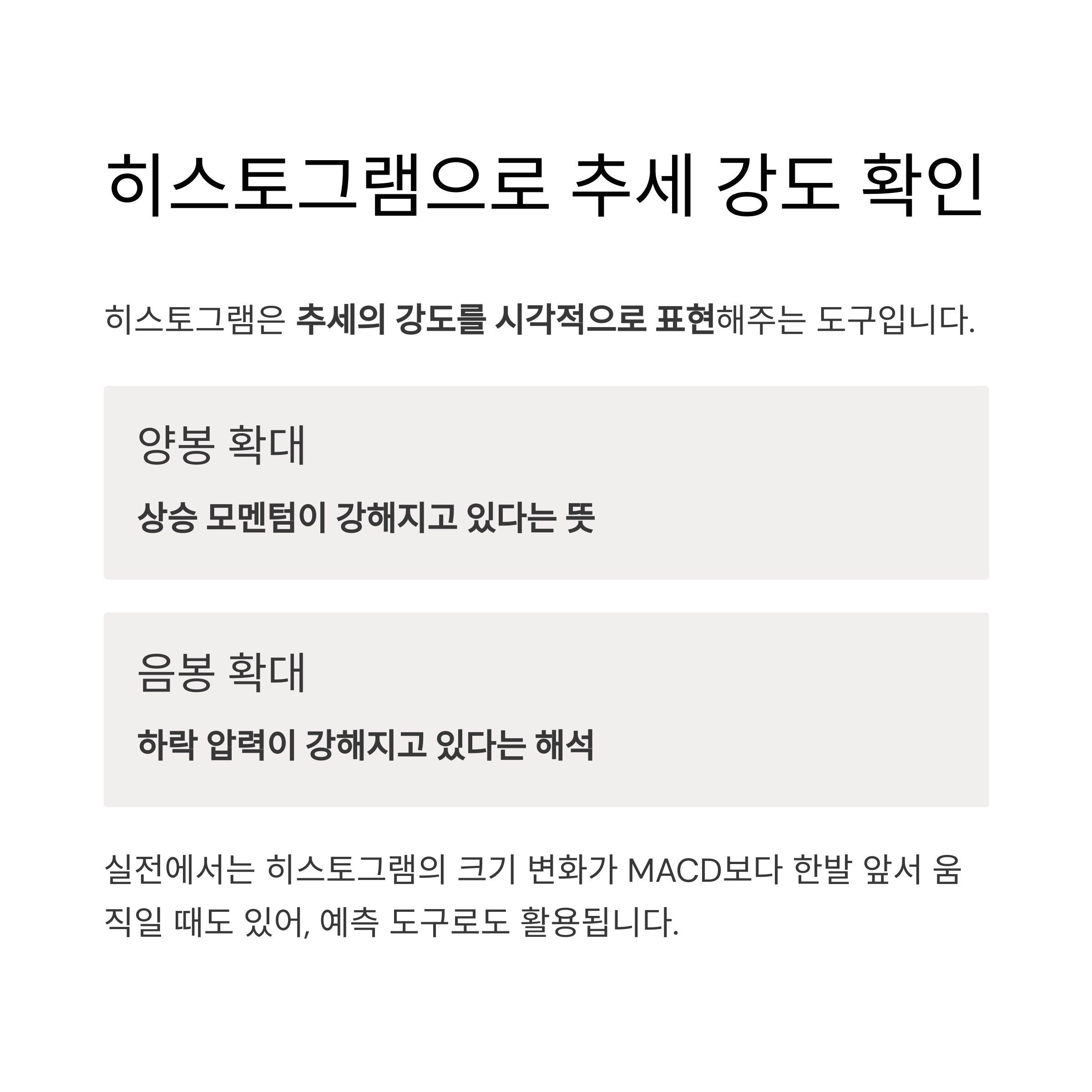 | 히스토그램 | MACD선 - 시그널선 차이 | 양/음봉으로 표현 |