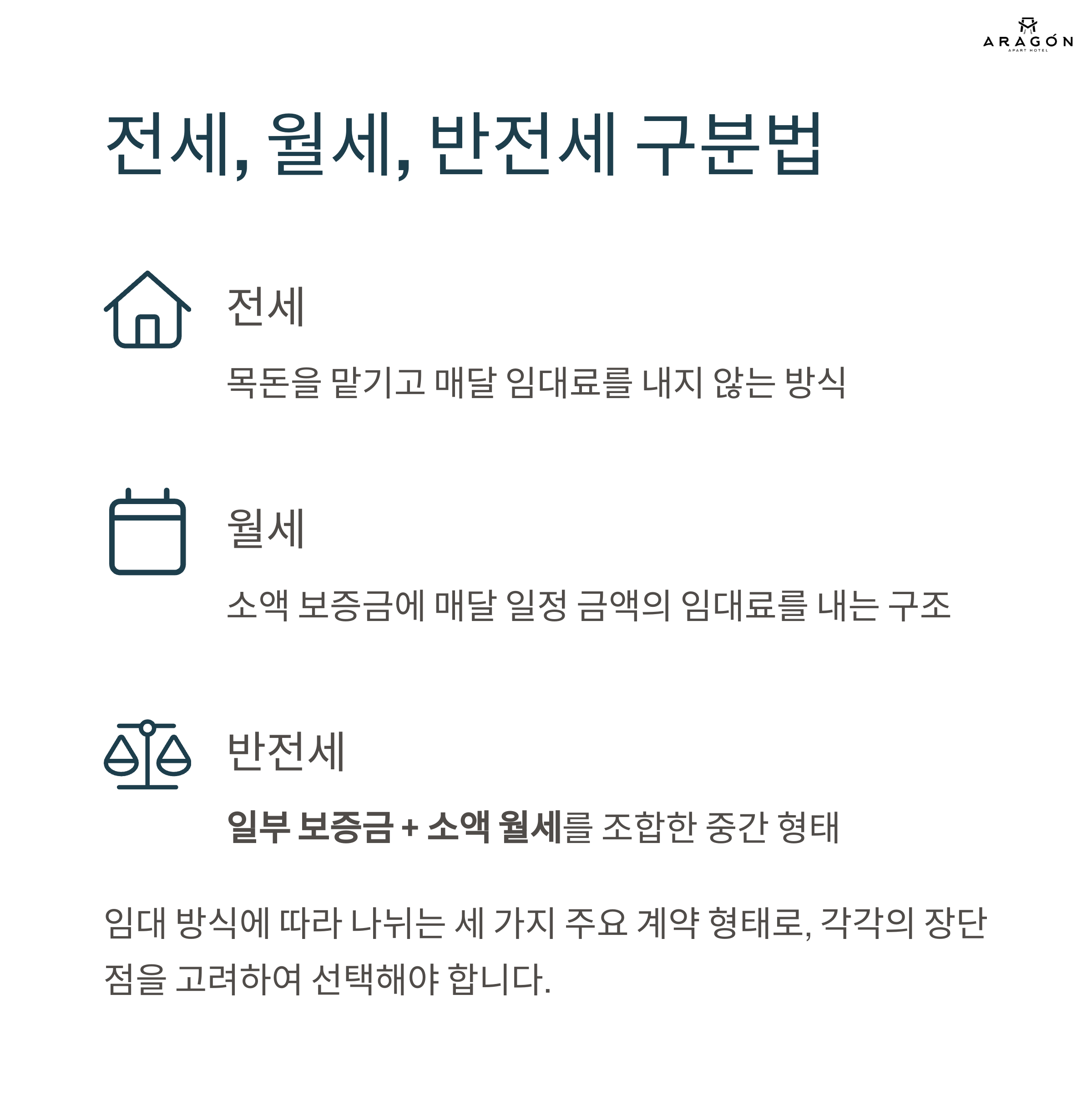 임대 방식에 따라 나뉘는 세 가지 주요 계약 형태입니다