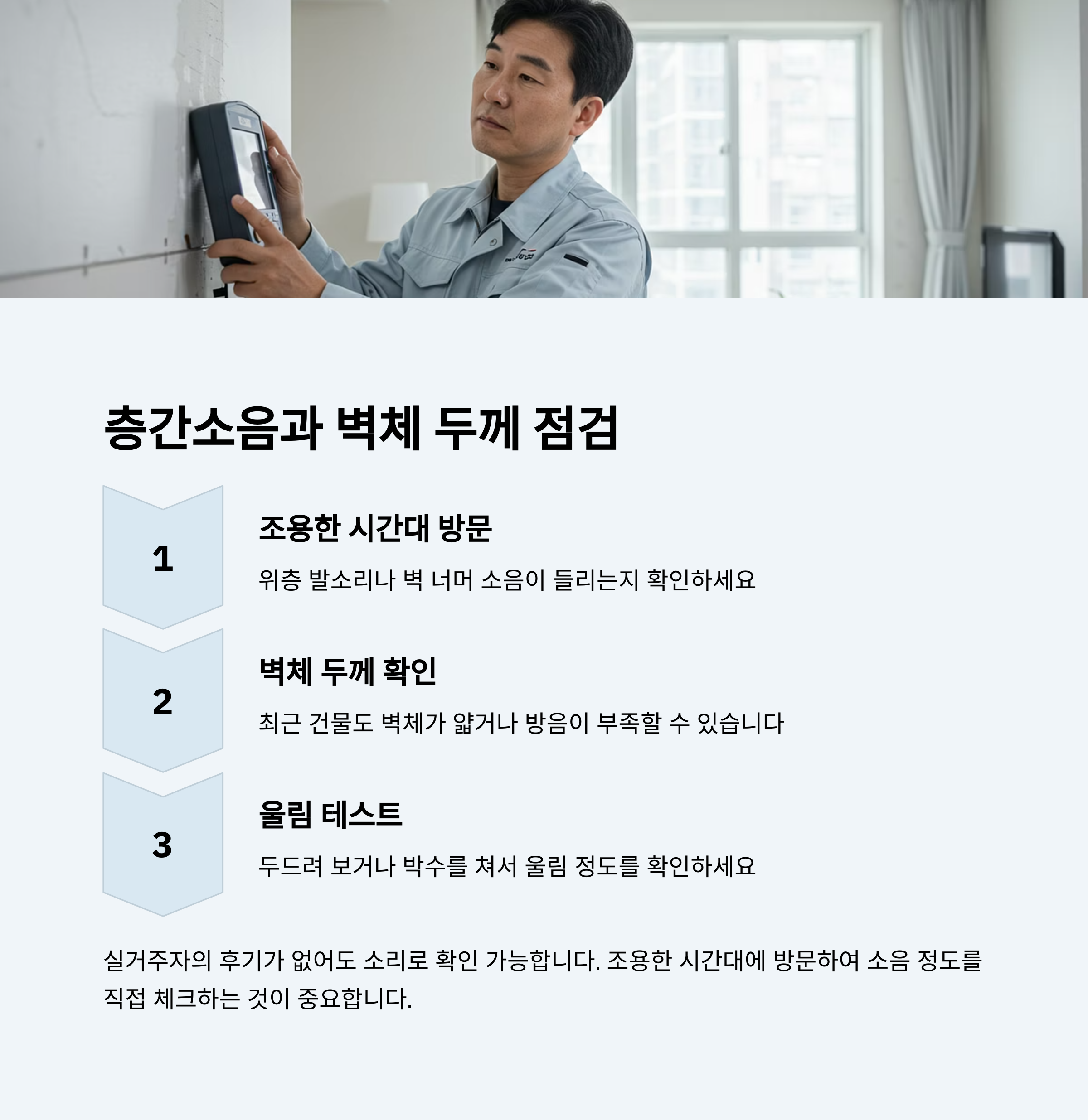 조용한 시간대에 방문하여 위층 발소리나 벽 너머 소음이 들리는지 들어보는 것이 좋습니다.