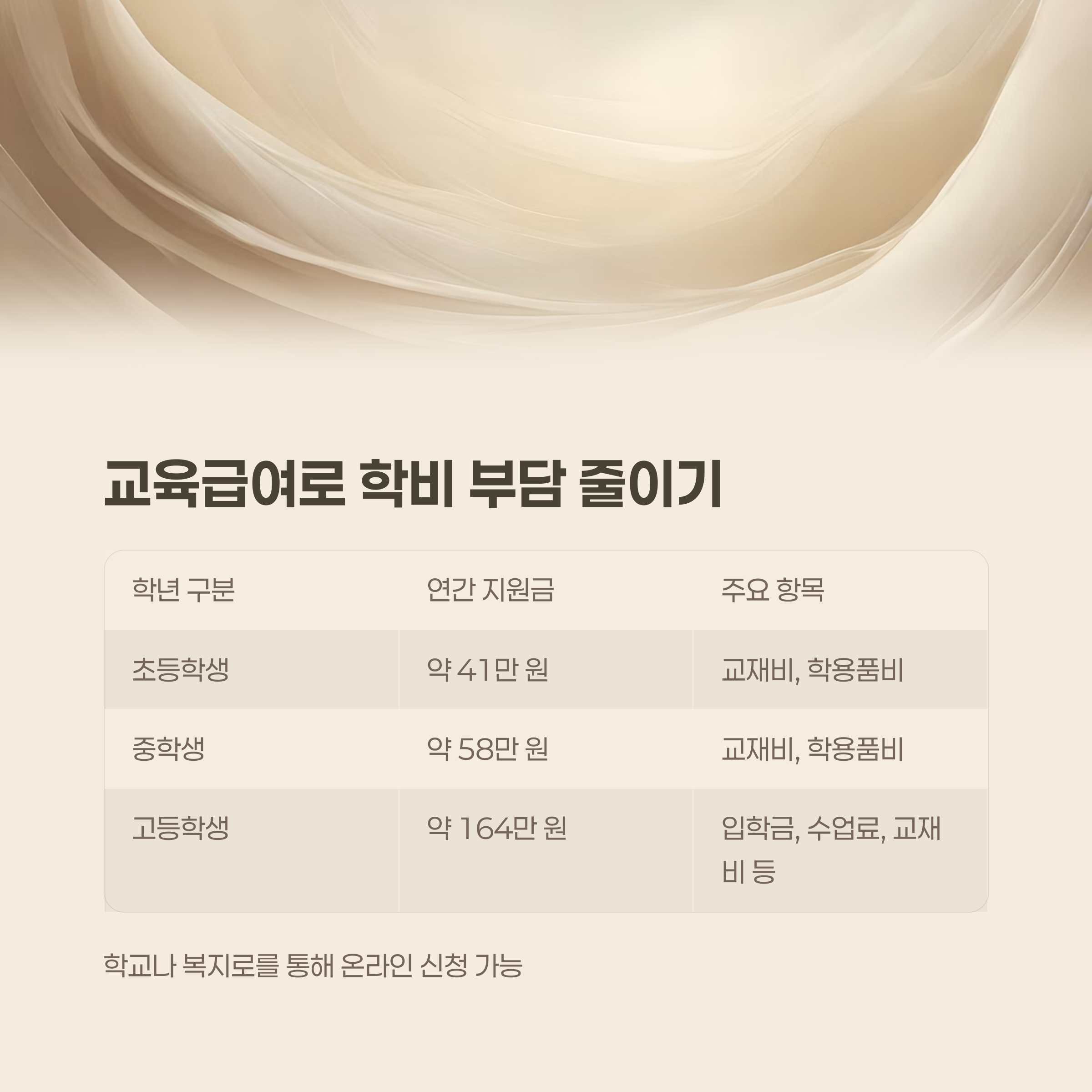 교육급여는 중위소득 50% 이하 가구의 초·중·고 학생에게 지급되는 제도입니다.