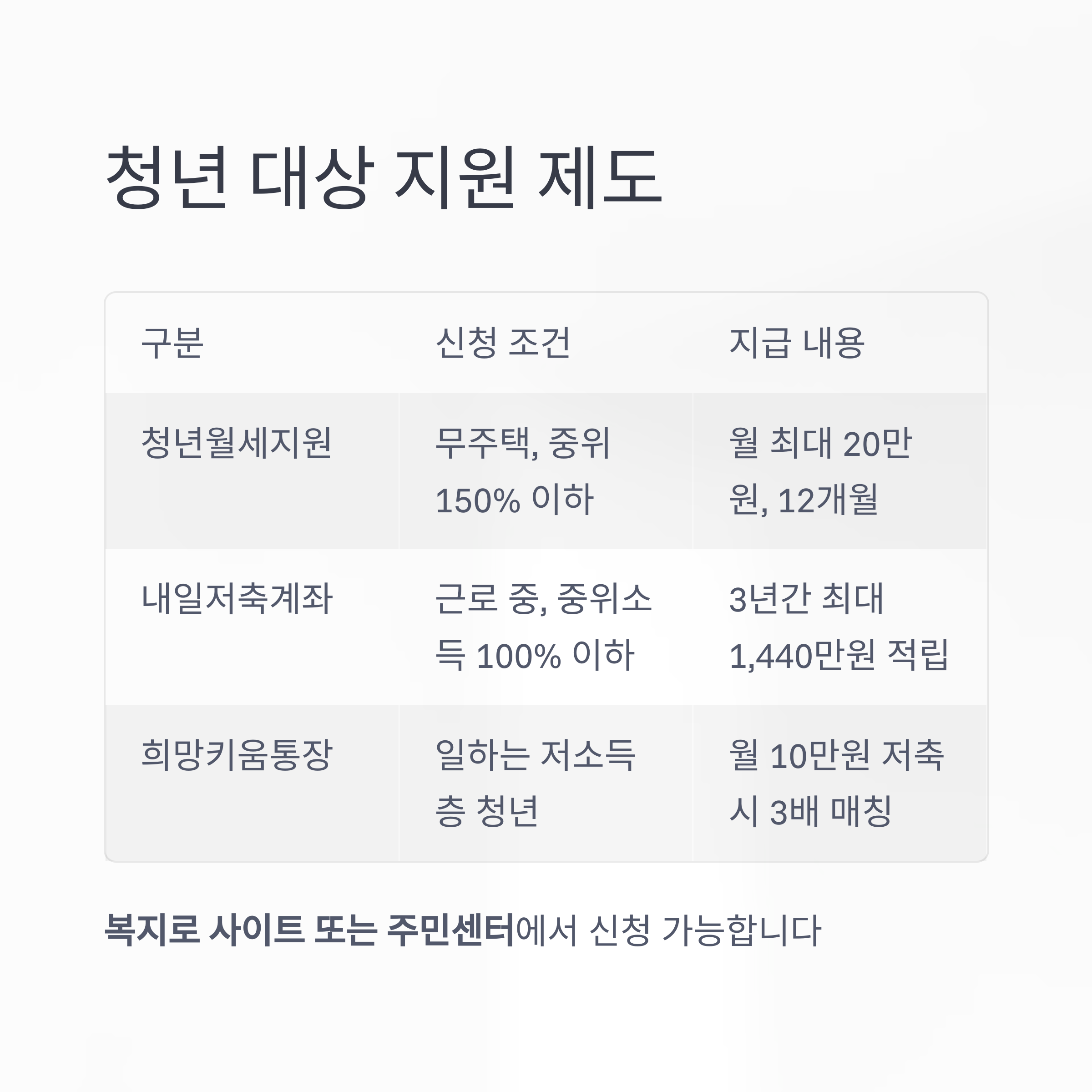 | 청년월세지원 | 무주택, 소득 중위 150% 이하 | 월 최대 20만 원, 12개월 |