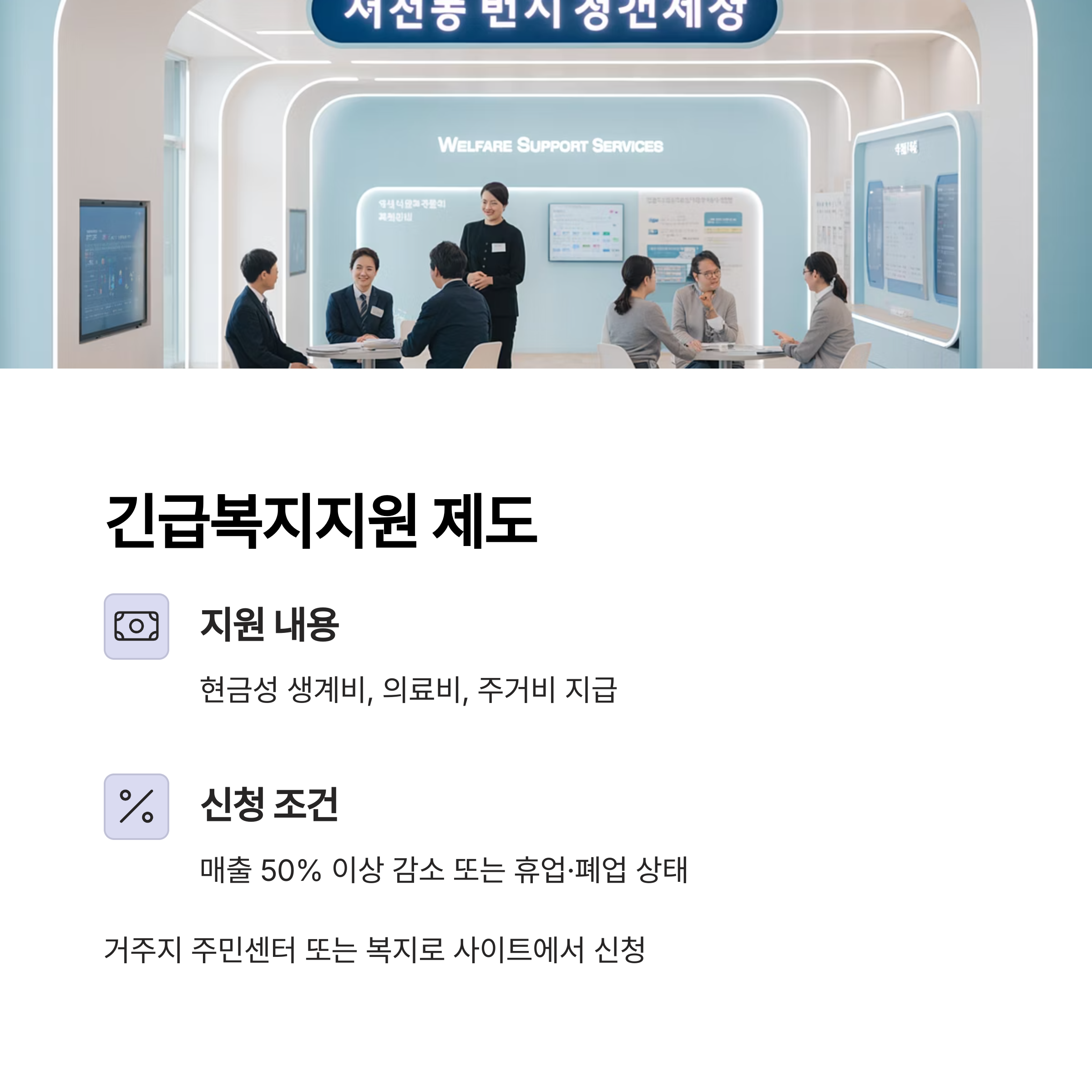 복지부 산하 긴급복지지원제도를 통해 현금성 생계비를 지급받을 수 있습니다