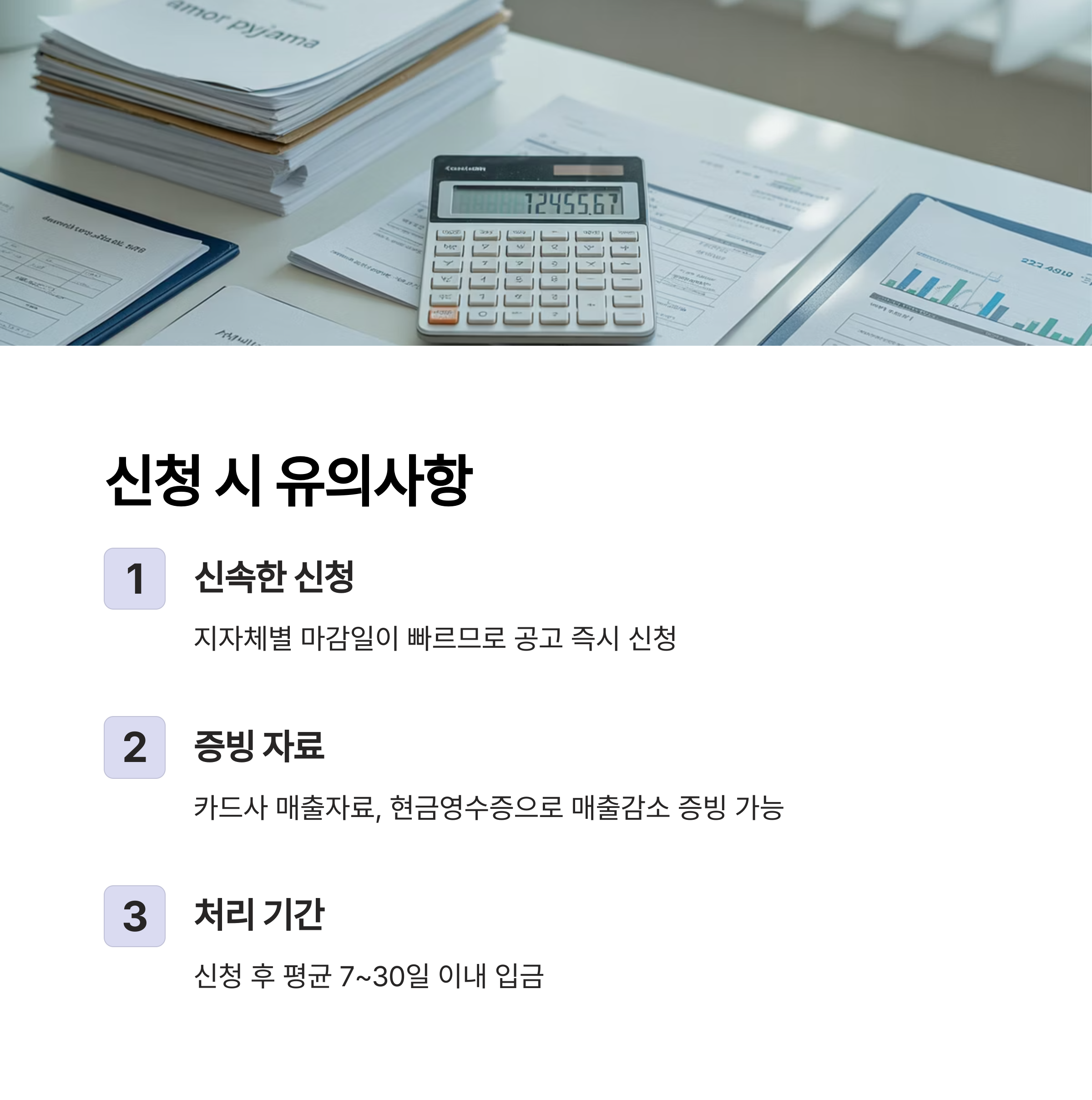 3. 신청 후 평균 7~30일 이내 입금되며, 전화로 사전심사 여부 확인 권장