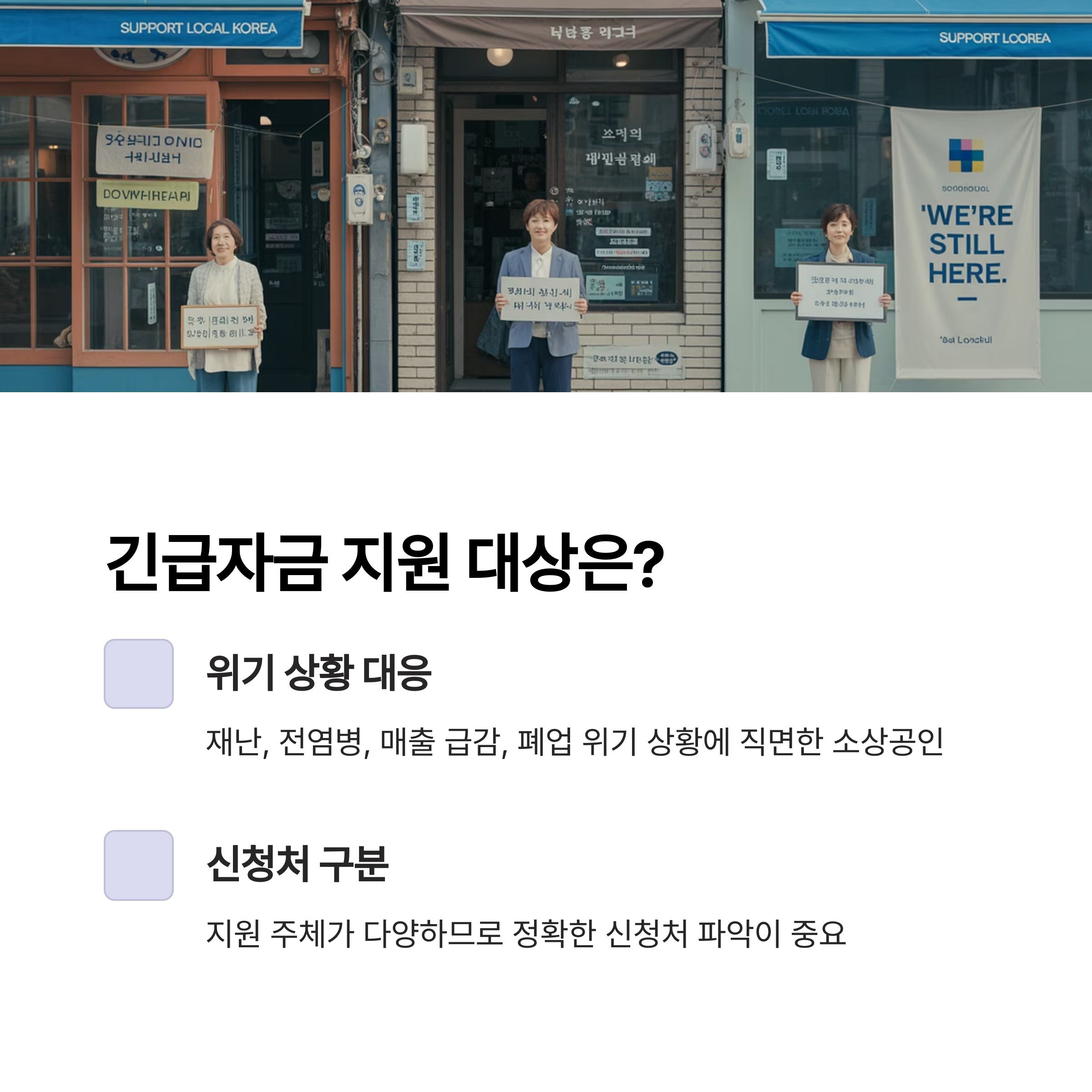 긴급자금은 재난, 전염병, 매출 급감, 폐업 위기 등 위기상황에 직면한 소상공인을 위한 제도로