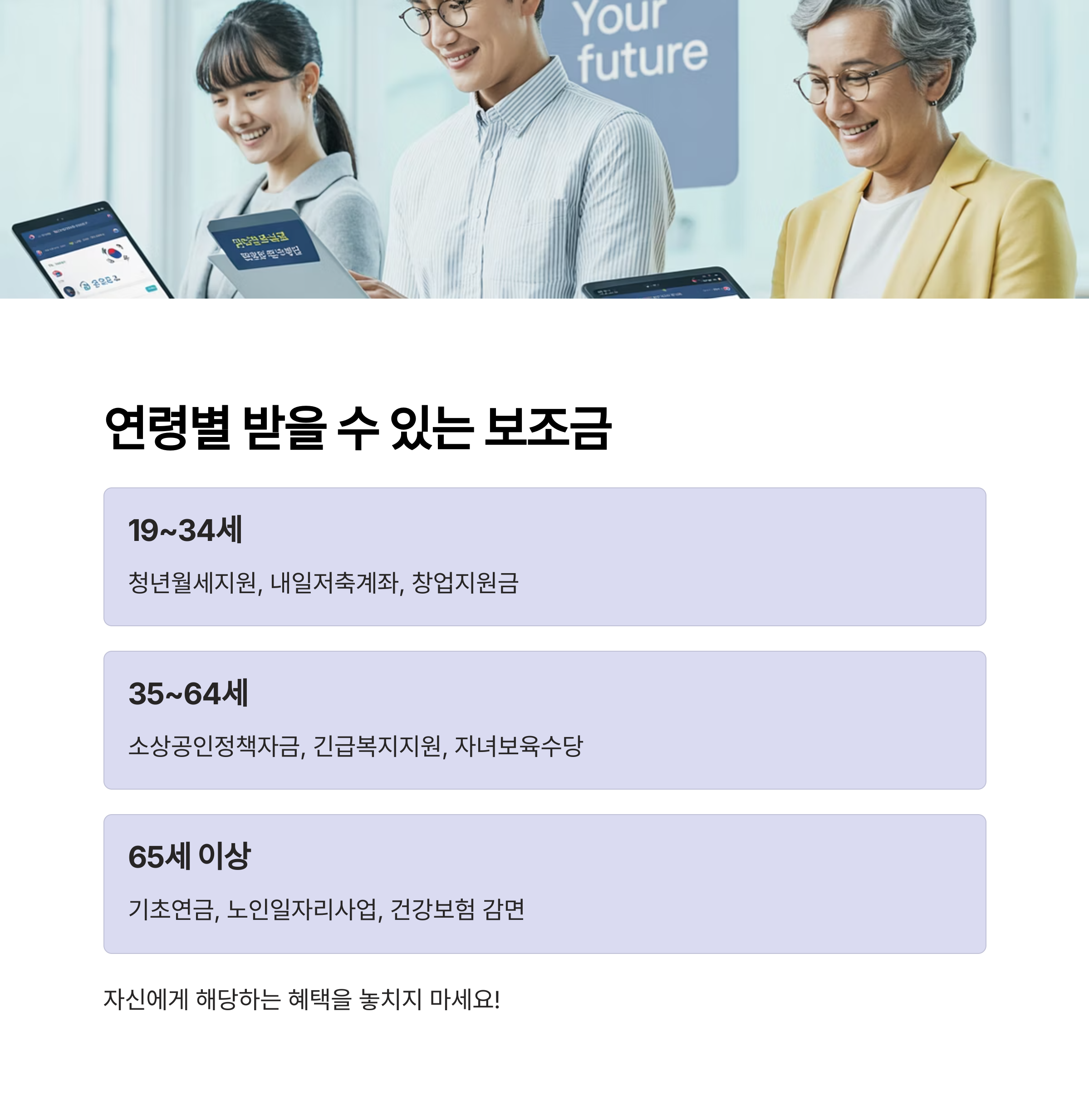 정부 보조금은 연령대별로 받을 수 있는 항목이 뚜렷하게 구분됩니다