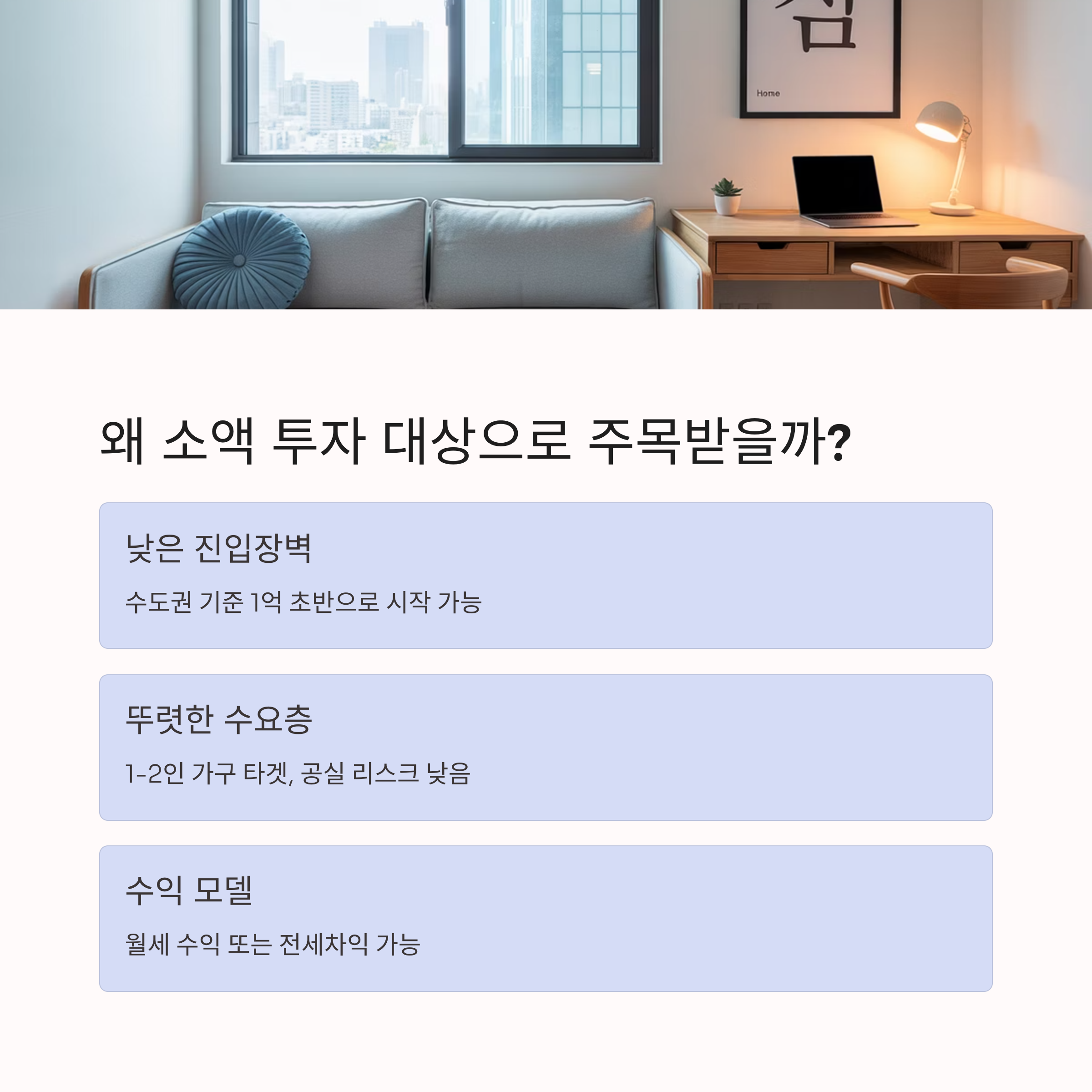 이번 글에서는 소형 오피스텔의 구조, 수익 모델, 장단점, 투자 조건을