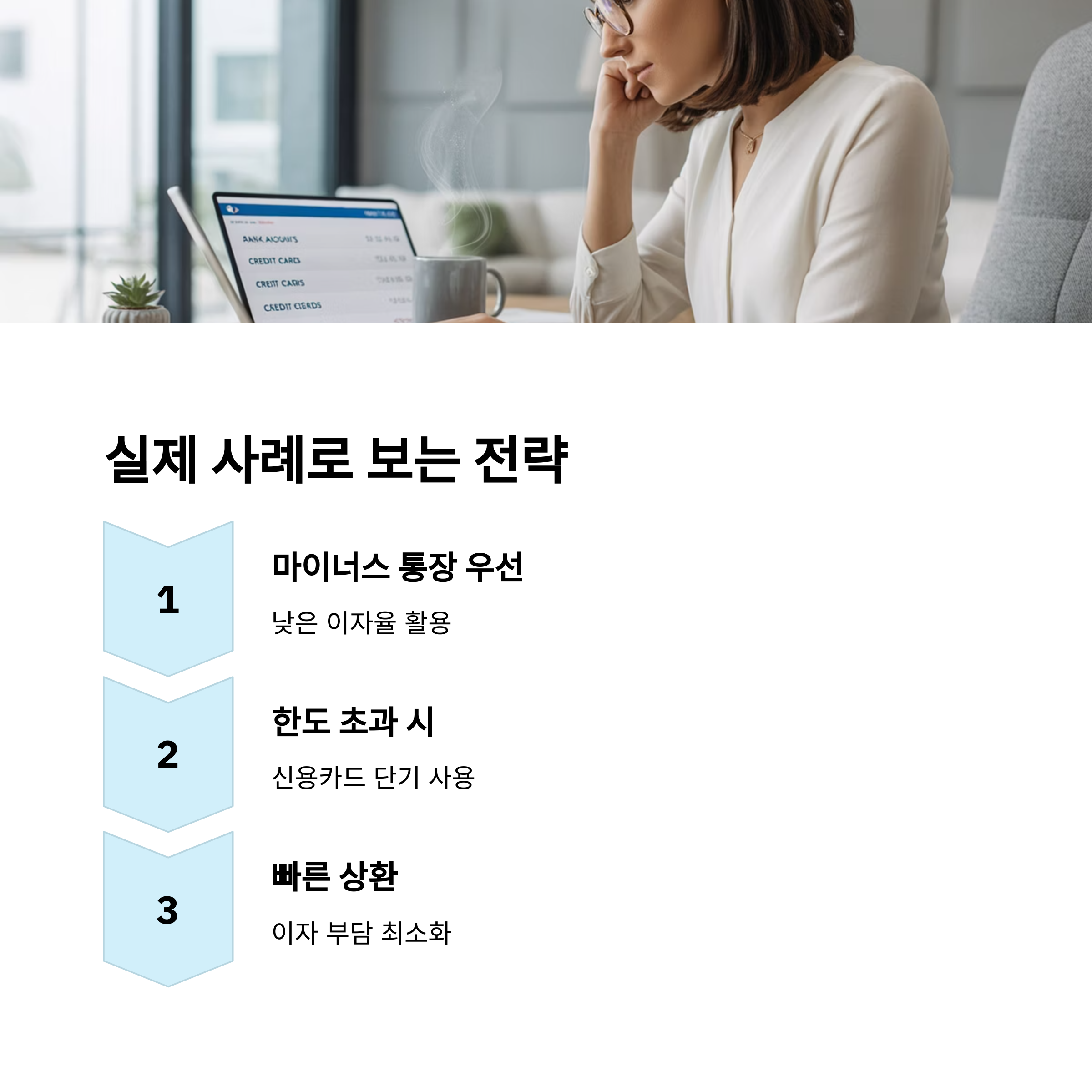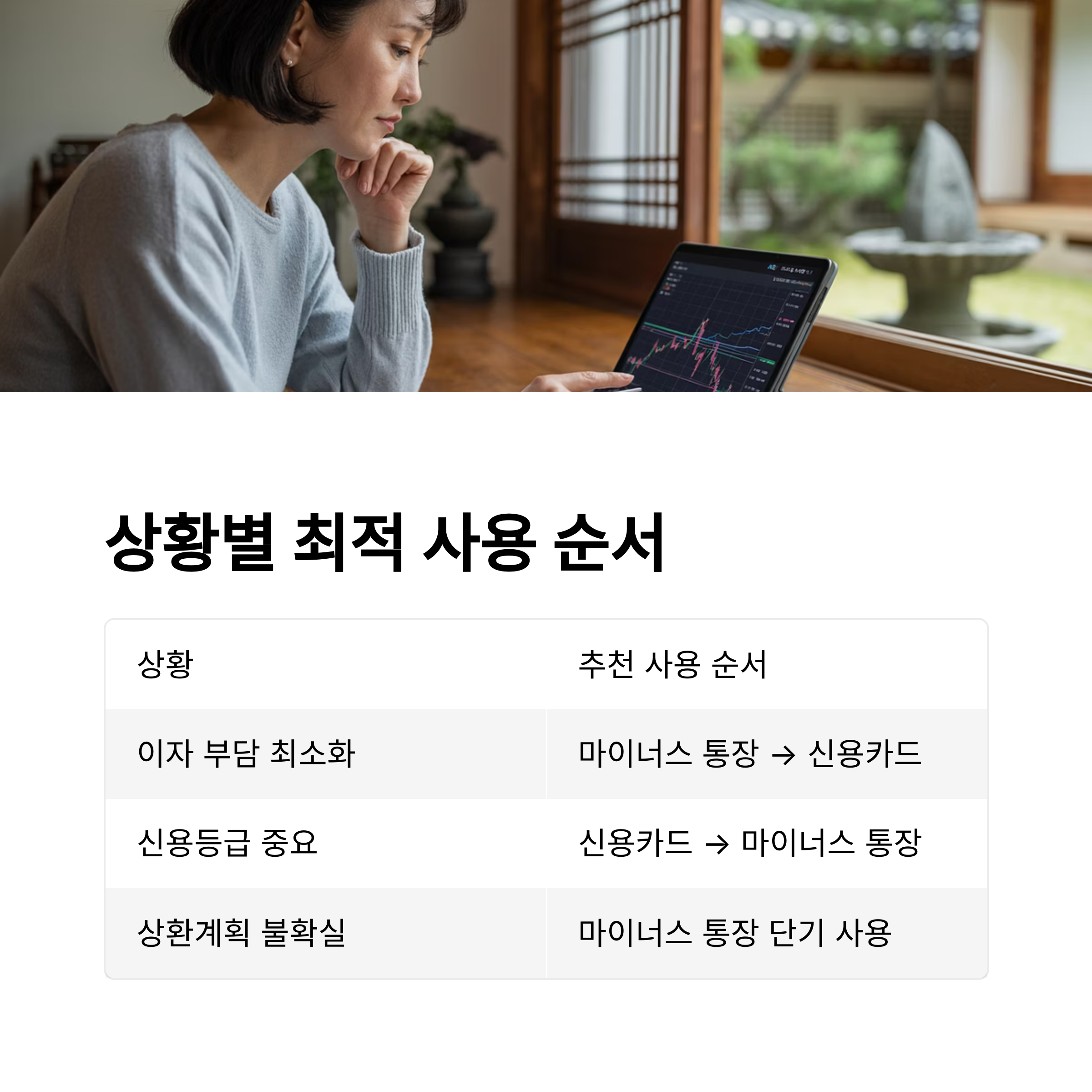 A: "이자율, 상환 계획, 신용등급 영향 등 세 가지를 꼭 따져보세요. 일반적으로 이자율이 낮은 쪽(보통 마이너스 통장)을 먼저 활용하는 것이 유리합니다.