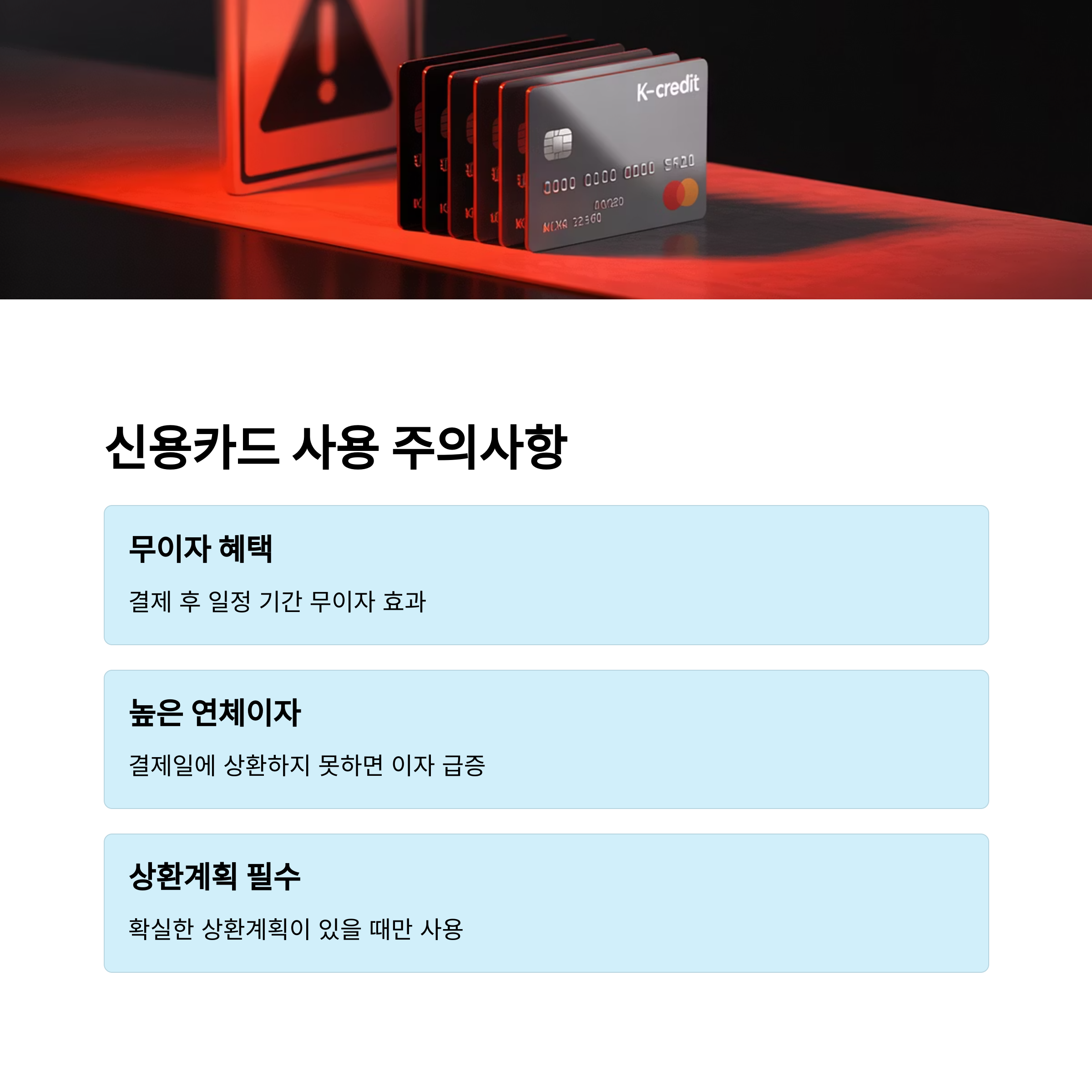 따라서 신용카드는 급한 지출 후 상환계획이 확실할 때만 활용하는 것이 중요합니다.