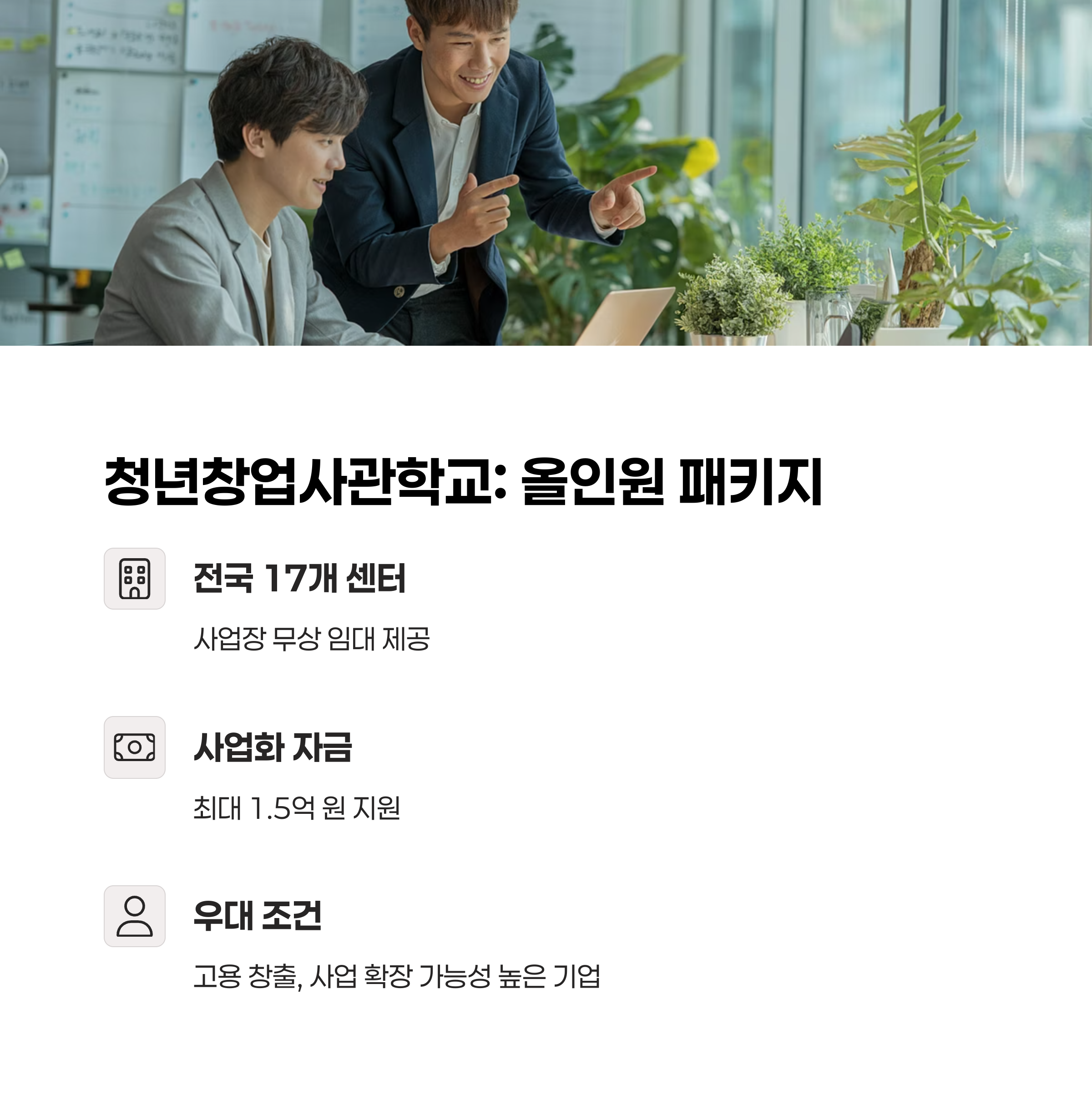 혜택 사업장 무상 임대 + 사업화 자금 최대 1.5억