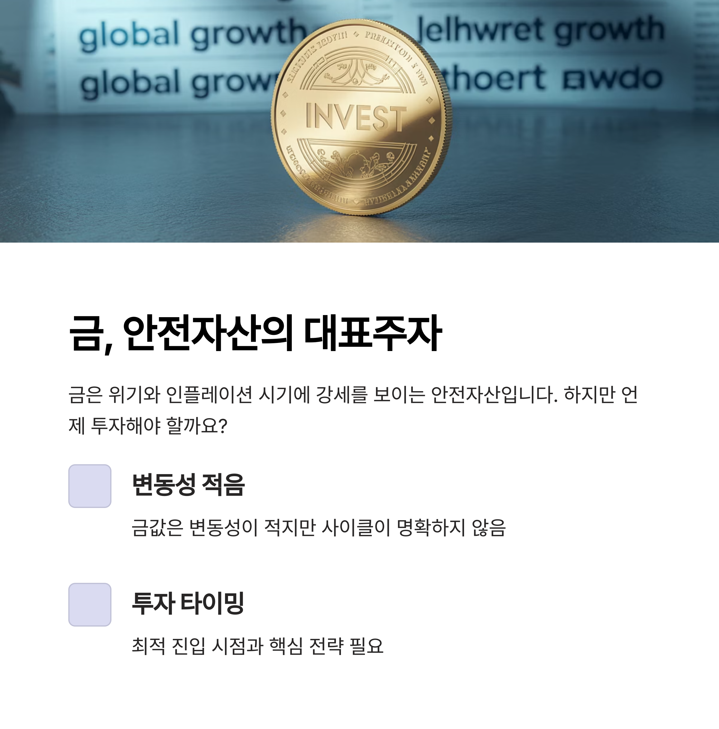 금은 대표적인 안전자산으로, 전쟁이나 금융 위기, 인플레이션 시기에 강한 모습을 보입니다. 하지만 금값은 변동성이 적은 대신 오르고 내리는 사이클이 명확하지 않기 때문에 "언제가 최적기인가?"라는 질문은 늘 어렵습니다. 이 글에서는 순금 투자의 적절한 진입 시점과 함께, 타이밍보다 중요한 핵심 전략들을 함께 정리해드립니다.