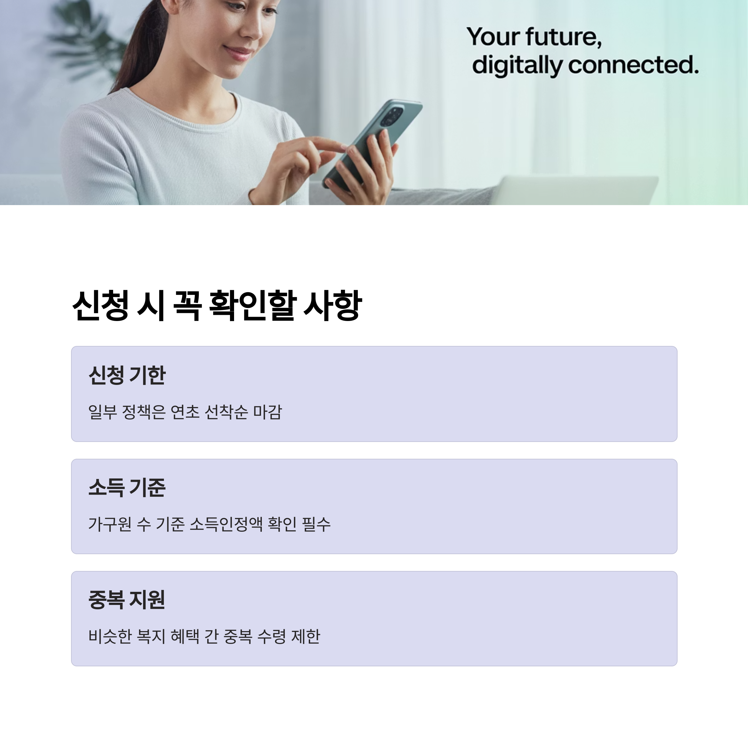 - 중복 지원 여부: 비슷한 복지 혜택 간 중복 수령 제한 있음