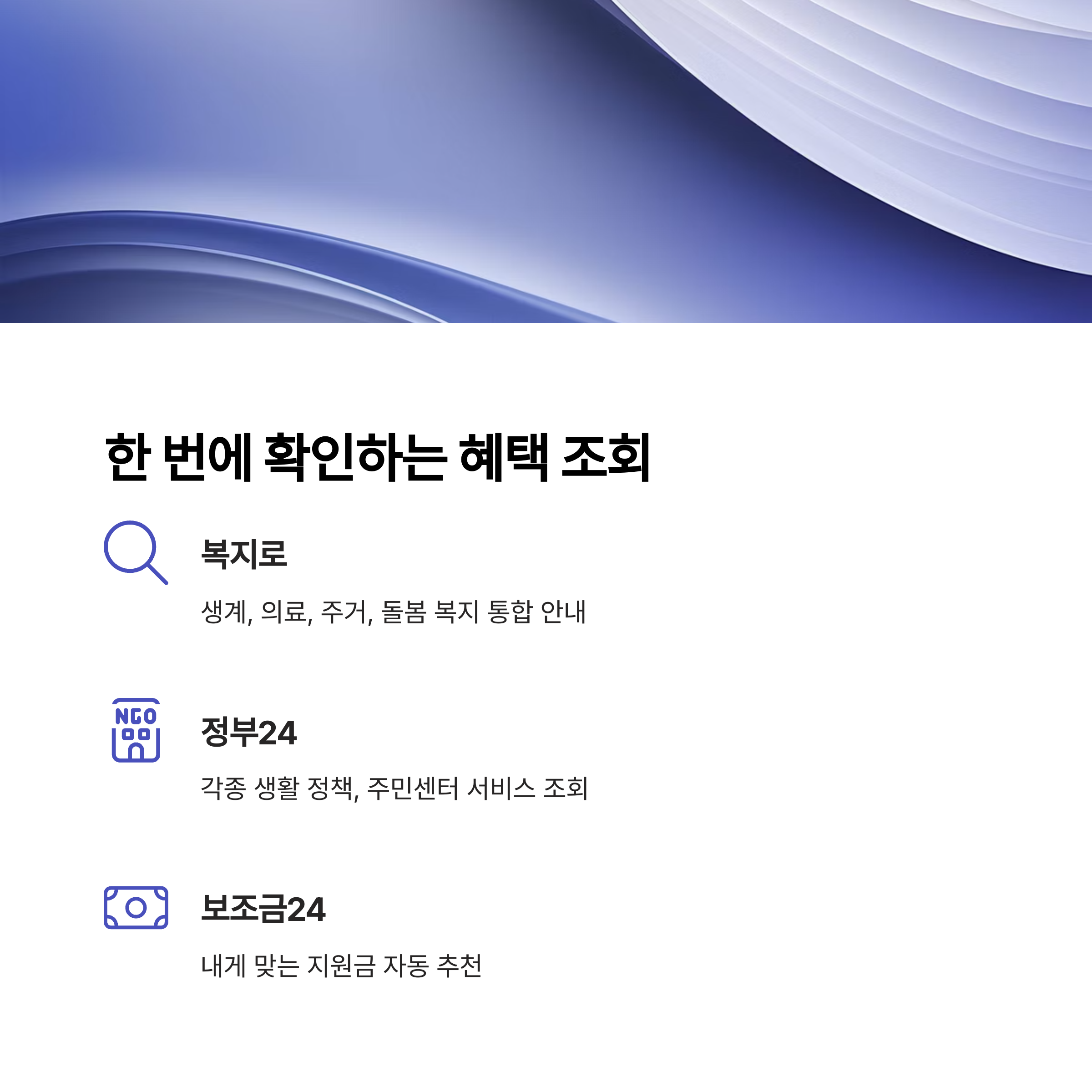 | 복지로 | 생계, 의료, 주거, 돌봄 복지 통합 안내 | www.bokjiro.go.kr |
