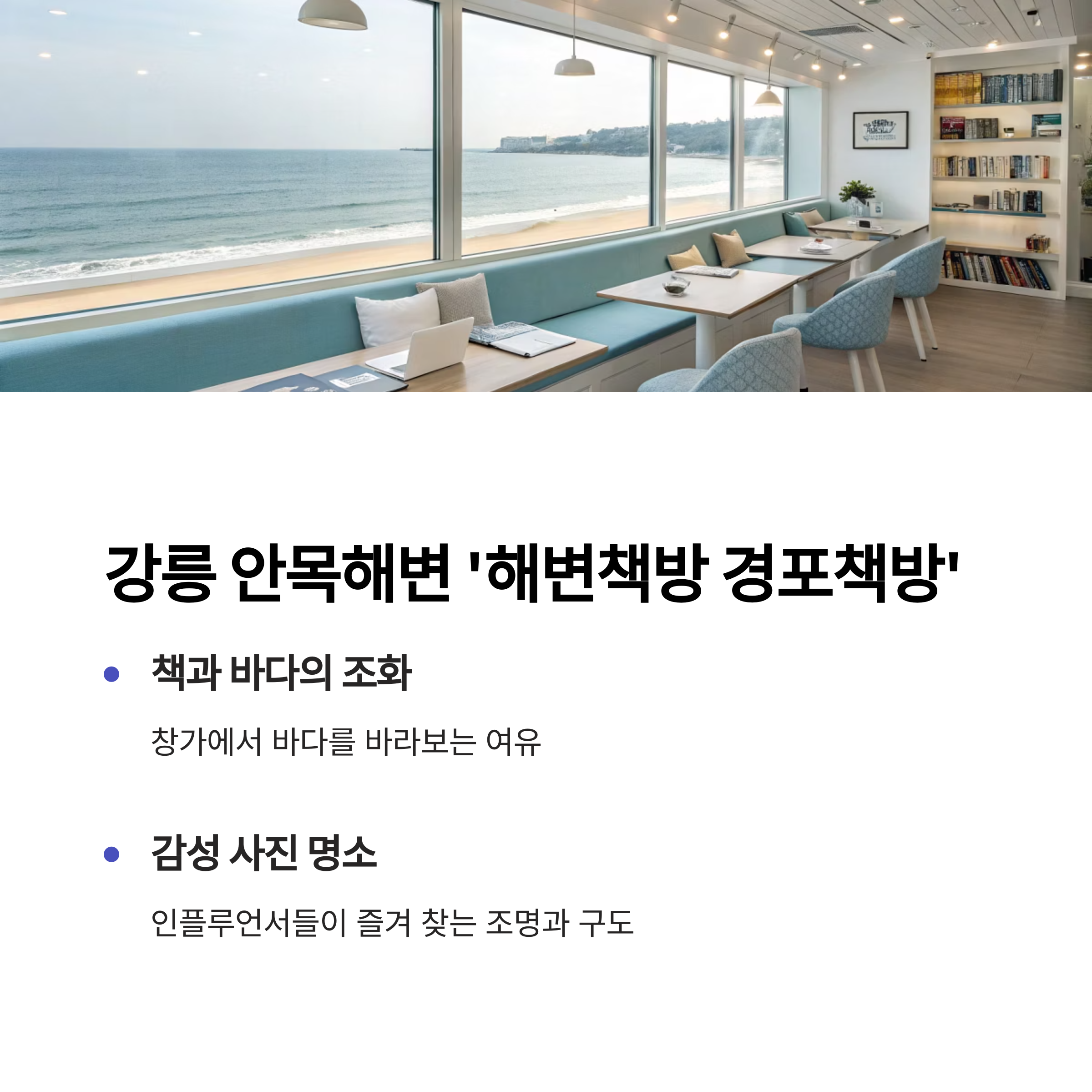 | 강릉 | 해변책방 | 바다+책+창가 조명, 조용한 무드 |