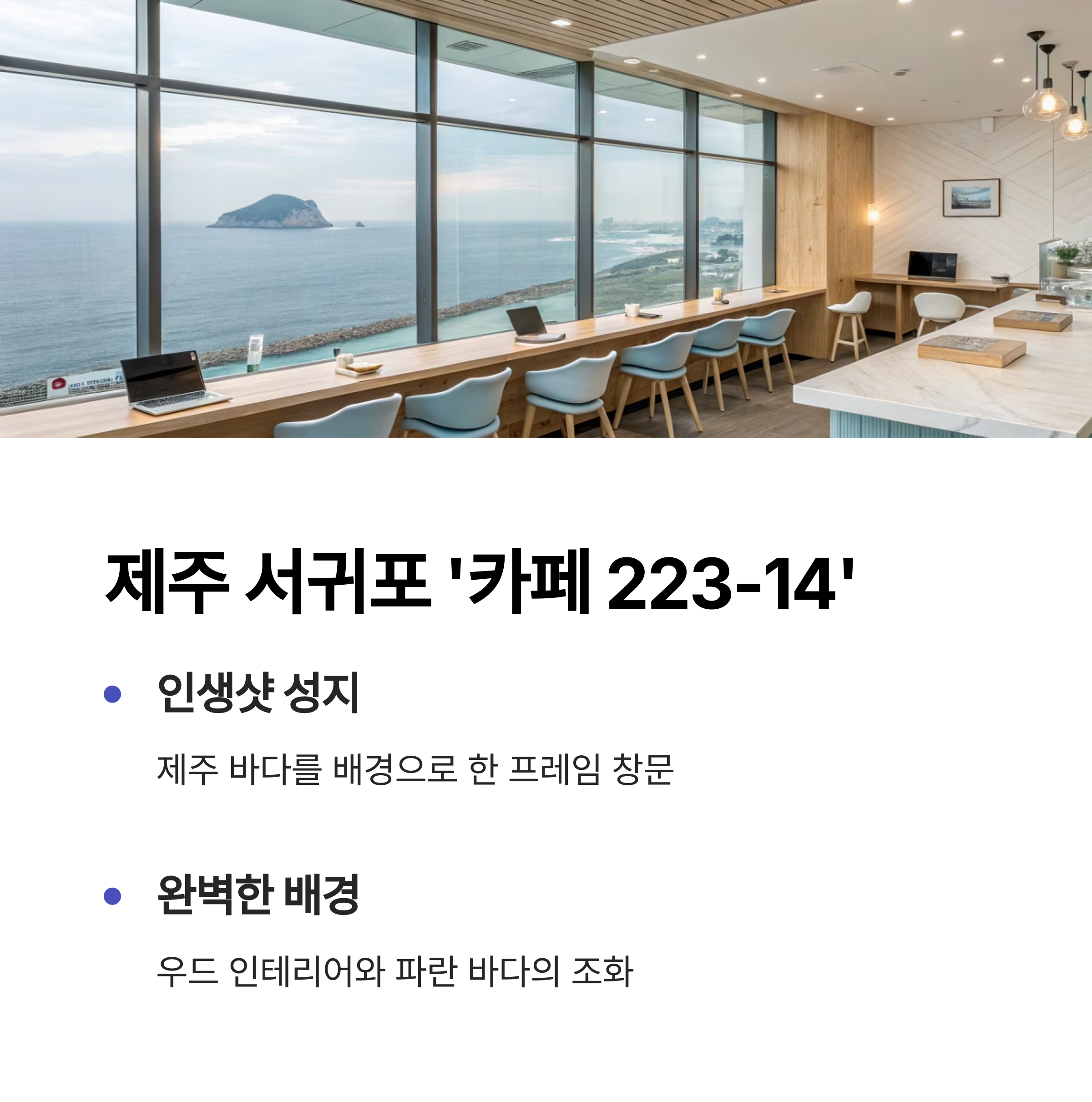 | 제주 | 카페 223-14 | 창틀 프레임+바다, 감성 우드 인테리어 |