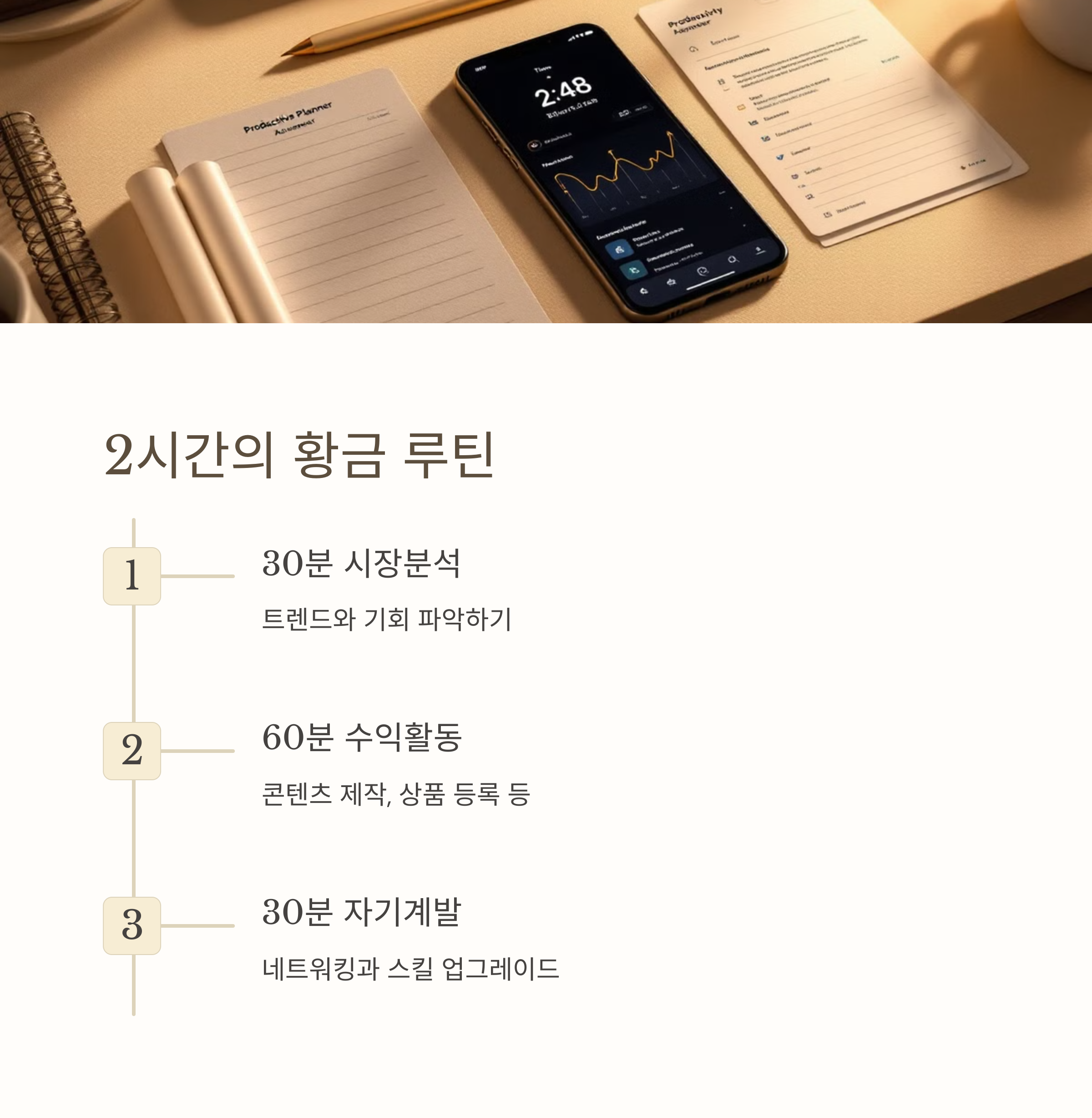 성공적인 투잡을 하는 사람들은 퇴근 후 2시간을 효과적으로 활용합니다. 이 시간을 어떻게 쓰느냐에 따라 수익의 차이가 극명하게 나타납니다.
