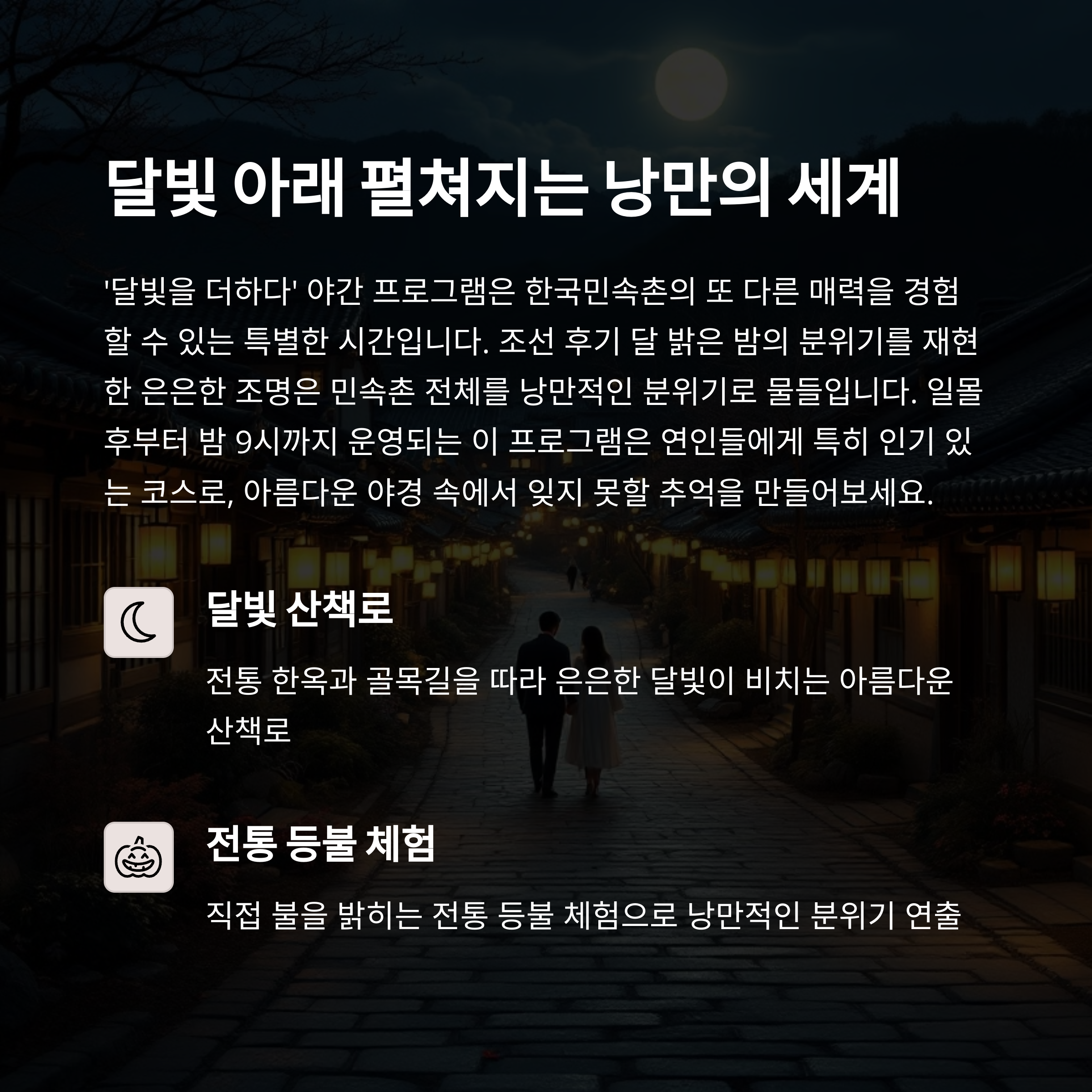 | 최대 59% 할인과 프로모션 진행 | 달빛을 더하다, 전통 분위기 만끽 | 공예 체험과 전통 공연 프로그램 |