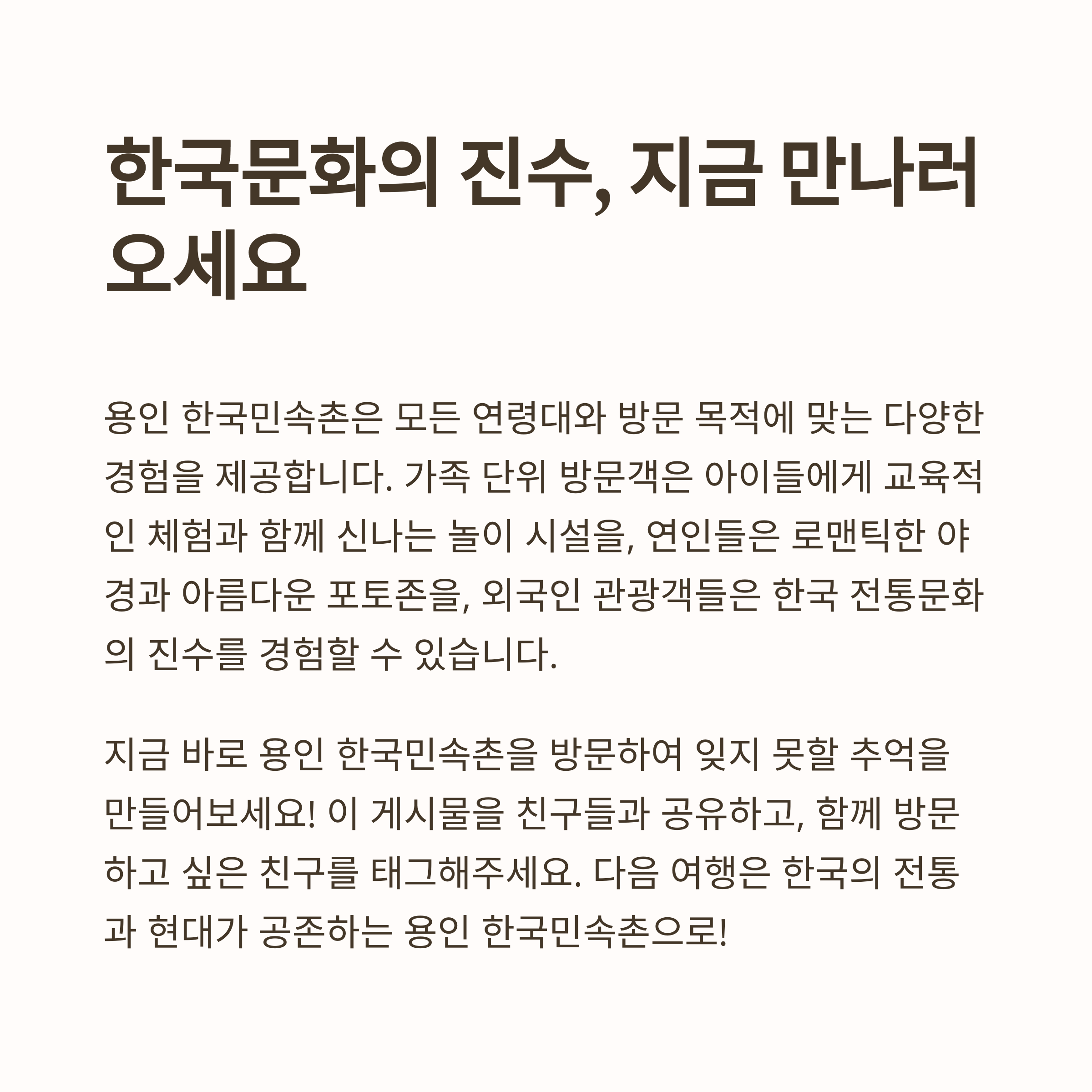 안녕하세요, 여러분. 오늘은 경기도 용인에 위치한 한국민속촌을 소개해드리려고 합니다. 한국민속촌은 한국의 전통 문화와 생활 방식을 직접 체험하고 즐길 수 있는 특별한 공간으로, 사계절 내내 다양한 행사와 체험이 준비되어 있어 가족, 친구, 연인과 함께 방문하기에 너무 좋은 곳입니다.
