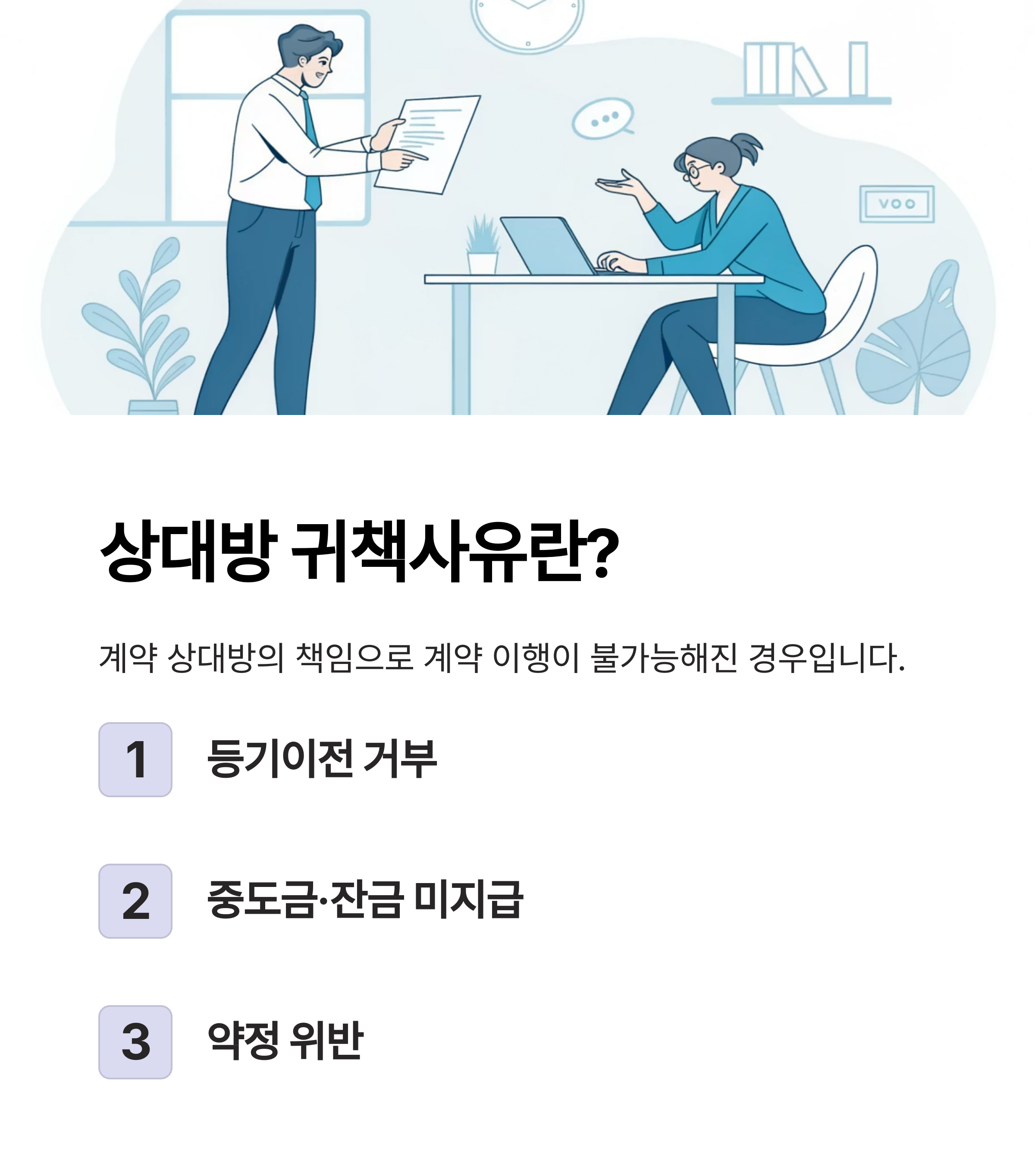 계약금 반환이 가능한 대표적인 경우는 "계약 해제 사유가 상대방의 귀책 사유"에 해당할 때입니다.