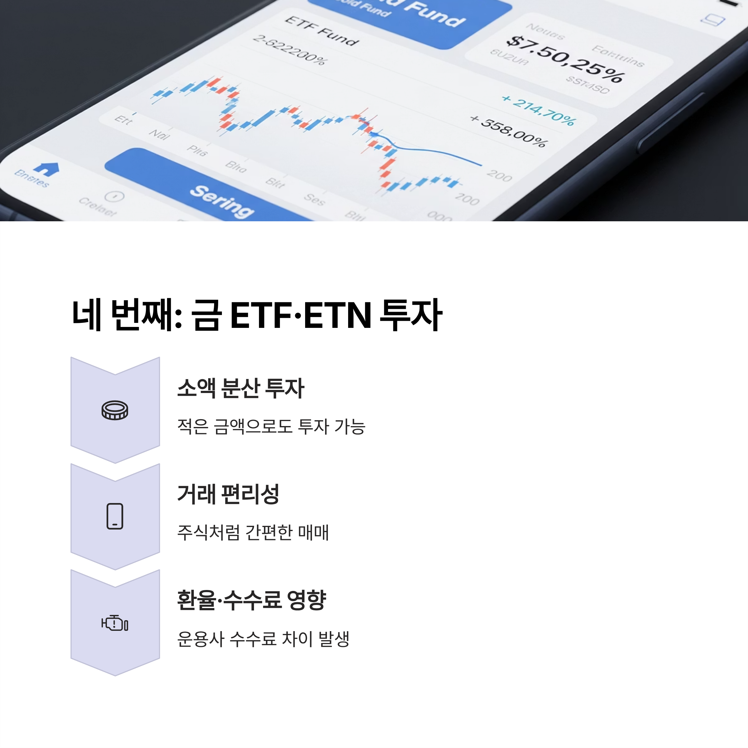 금 가격을 추종하는 ETF(상장지수펀드)나 ETN에 투자하는 방법도 있습니다.