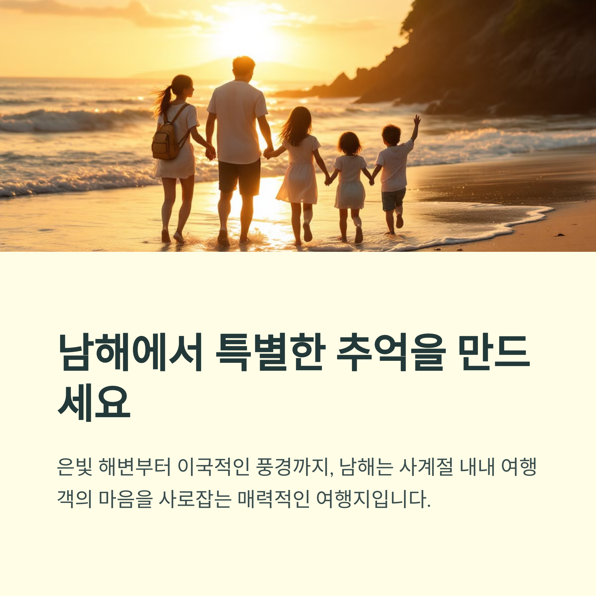 남해의 여행지는 그 다양성과 조화로움에서 진가를 발휘합니다. 해변에서의 여유로움, 산에서의 고요함, 어촌에서의 활력, 이국적인 분위기까지, 다양한 테마를 하루 또는 이틀 동안 자연스럽게 경험할 수 있는 점이 가장 큰 매력입니다. 특히 각 장소마다 특색 있는 행사나 체험 프로그램이 준비되어 있어, 가족, 연인, 친구 등 누구와 함께하더라도 만족스러운 여행을 보장합니다. 남해는 단순한 관광지를 넘어, 삶의 여유를 느끼게 해주는 공간으로 기억될 것입니다.