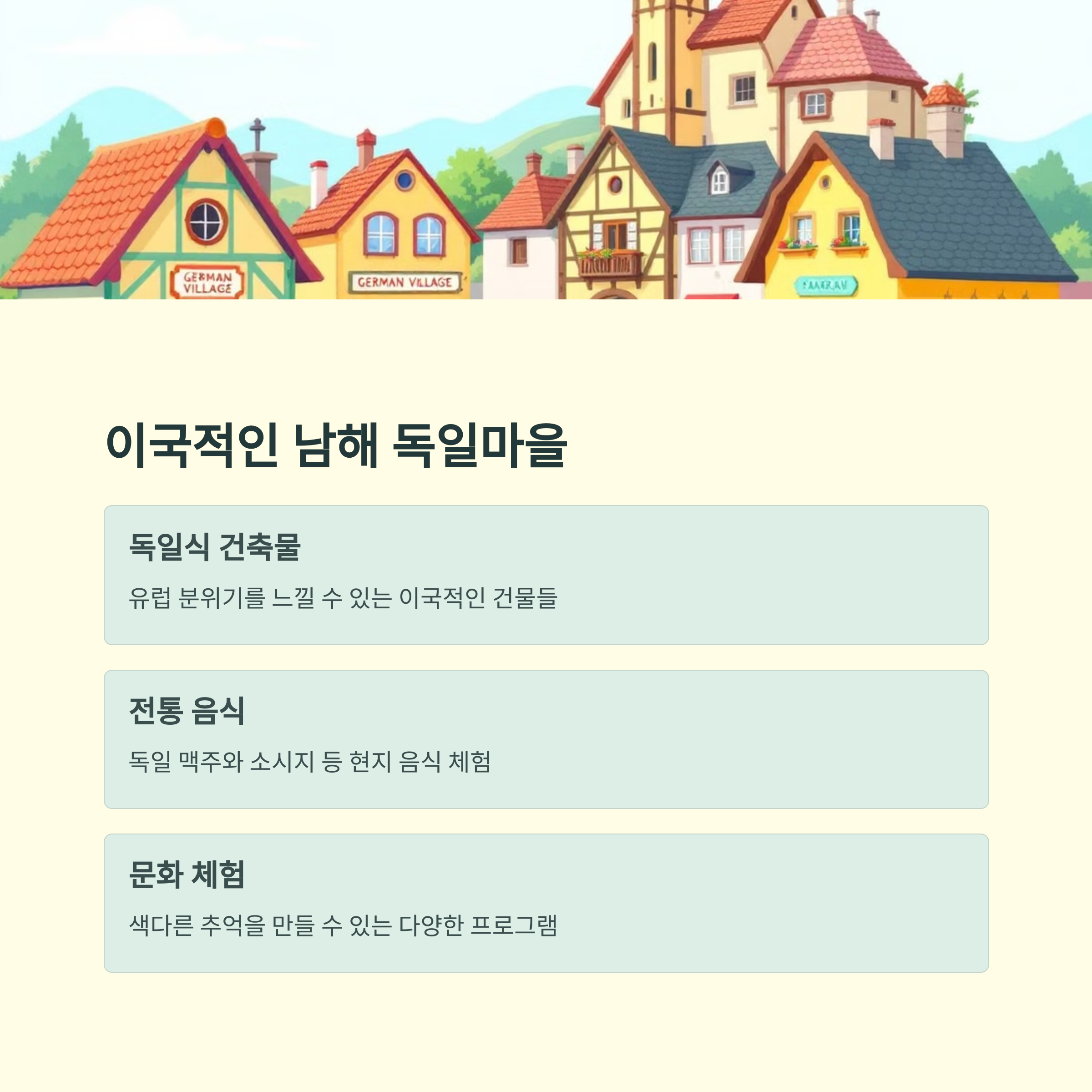 | 독일마을 | 이국적인 건축과 음식으로 독특한 문화 체험 제공 |