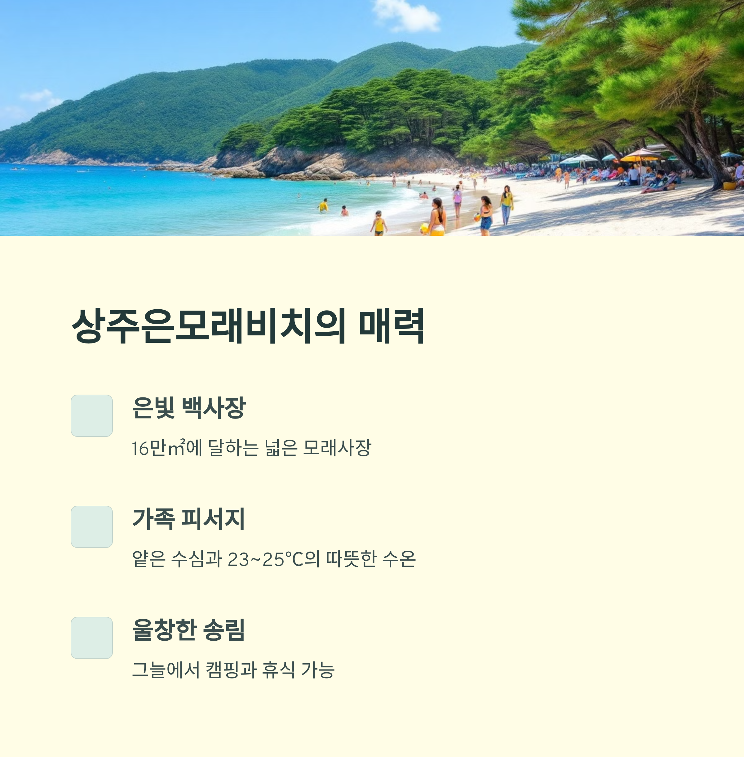 | 상주은모래비치 | 은빛 모래와 송림, 가족 피서에 최적화된 해변 |