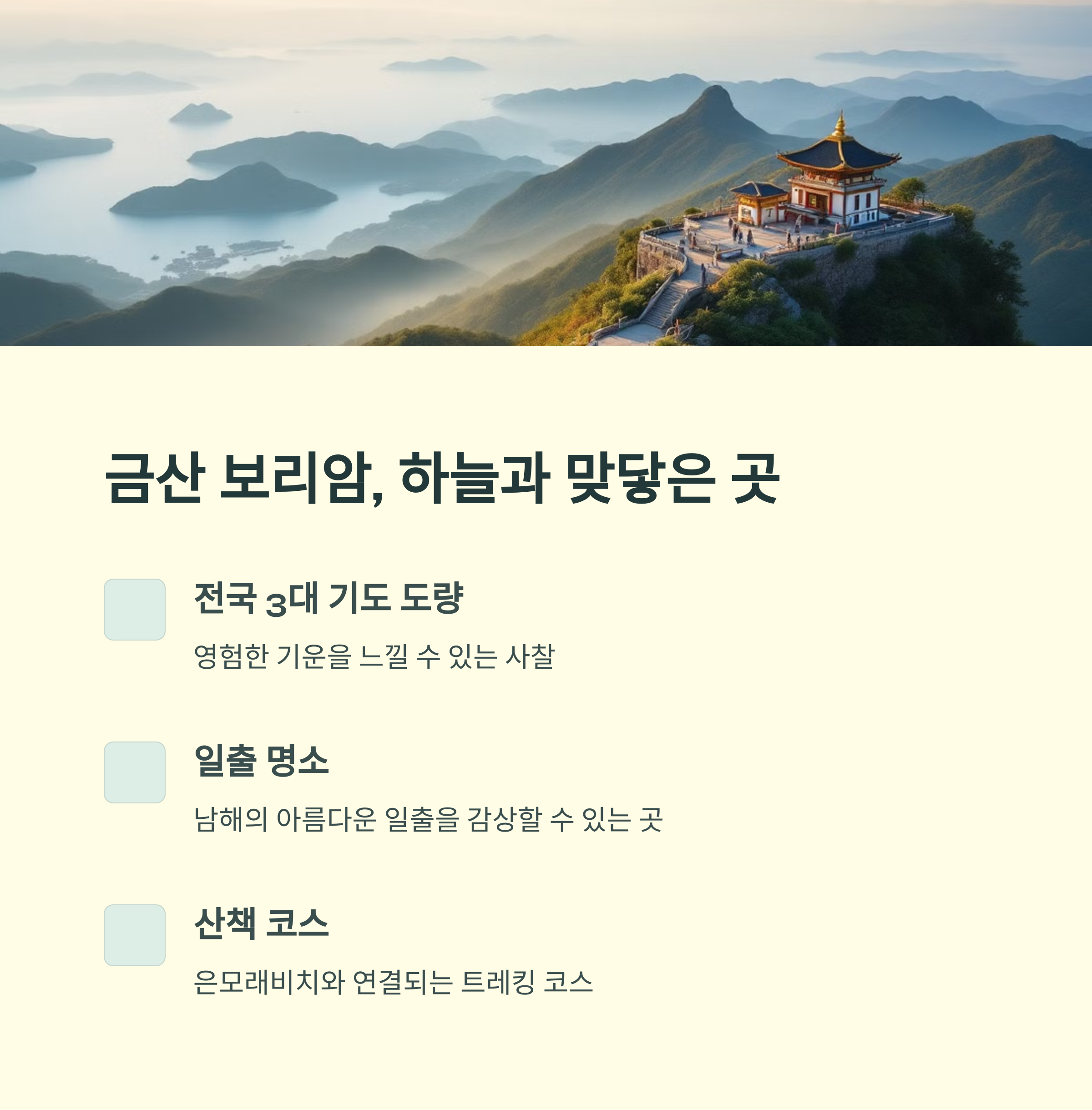 상주은모래비치 외에도 남해는 다양한 테마의 여행지들로 가득합니다. 예를 들어, 금산의 정상에 위치한 보리암은 전국 3대 기도 도량으로 유명하며, 일출을 감상할 수 있는 명소로도 인기가 높습니다. 또한, 독일마을은 해외 분위기를 물씬 느낄 수 있는 공간으로, 독일식 건축물과 맥주, 전통 음식을 즐길 수 있어 연인이나 친구들과의 색다른 추억 만들기에 안성맞춤입니다. 각 명소들은 서로 가까운 거리에 있어, 1박 2일 또는 당일치기 코스로도 충분히 소화할 수 있는 것이 큰 장점입니다.