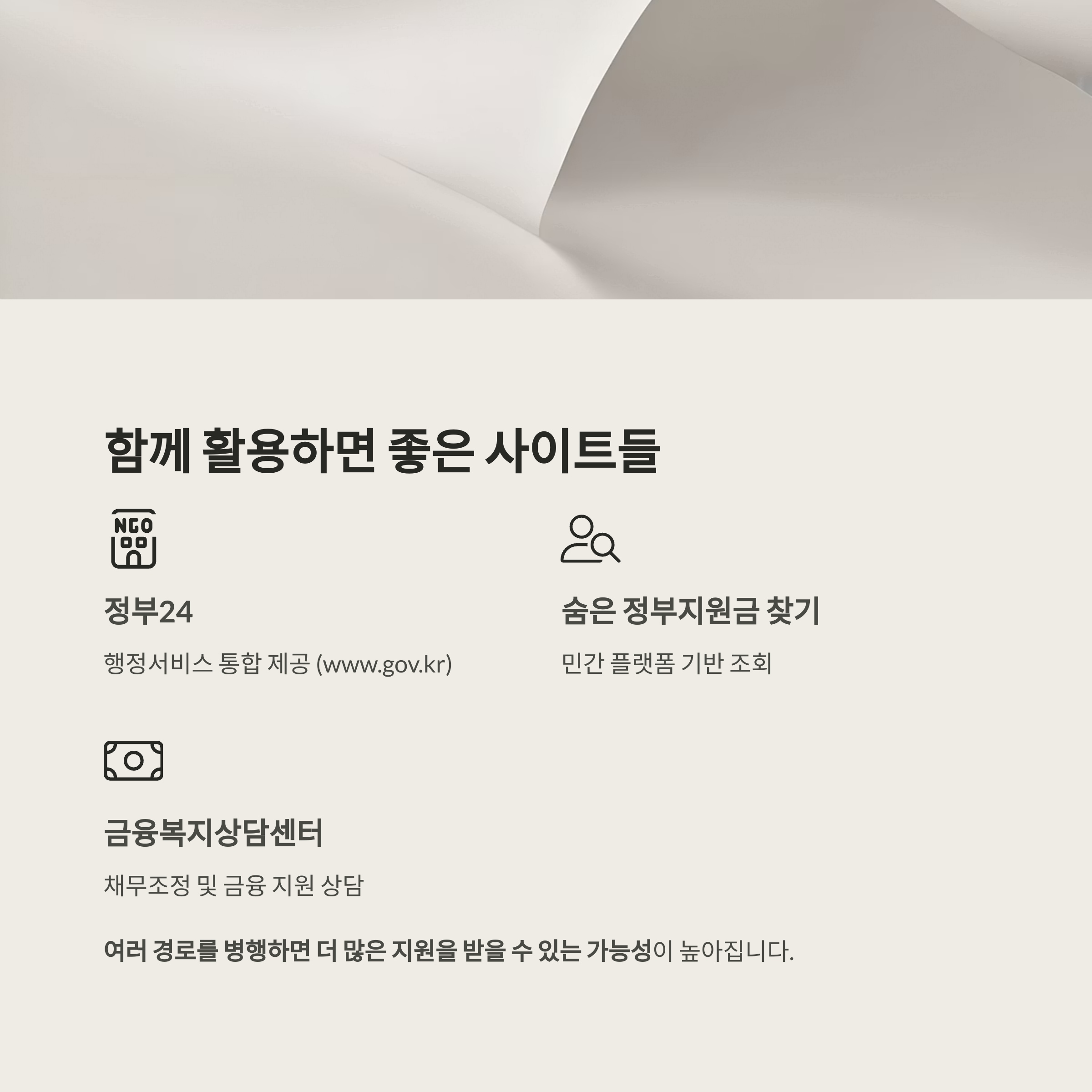 | 숨은 정부지원금 찾기 | 민간 플랫폼 기반 조회 | (카카오나 네이버에서 검색) |