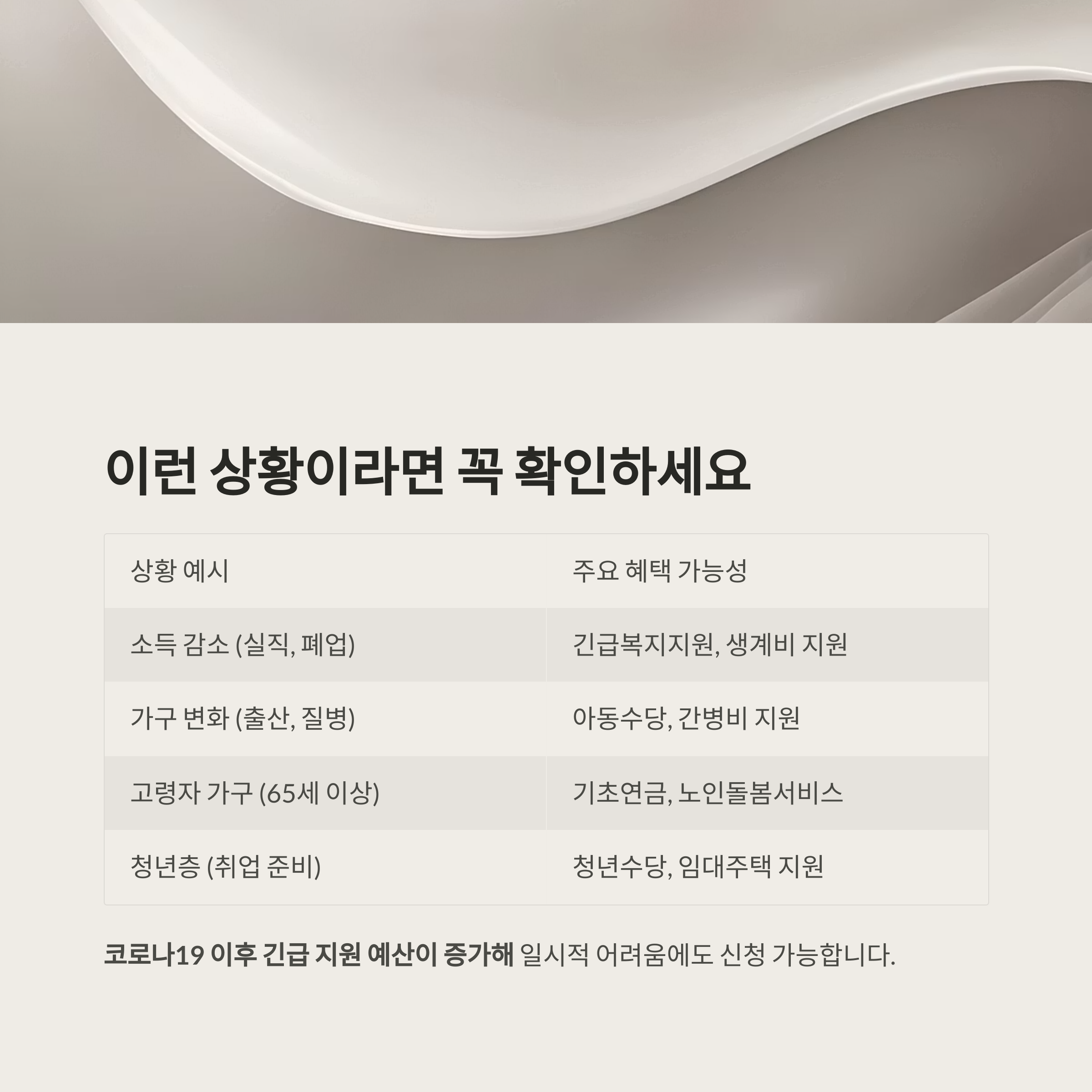| 소득 감소 | 실직, 폐업 등 | 긴급복지지원, 생계비 지원 |