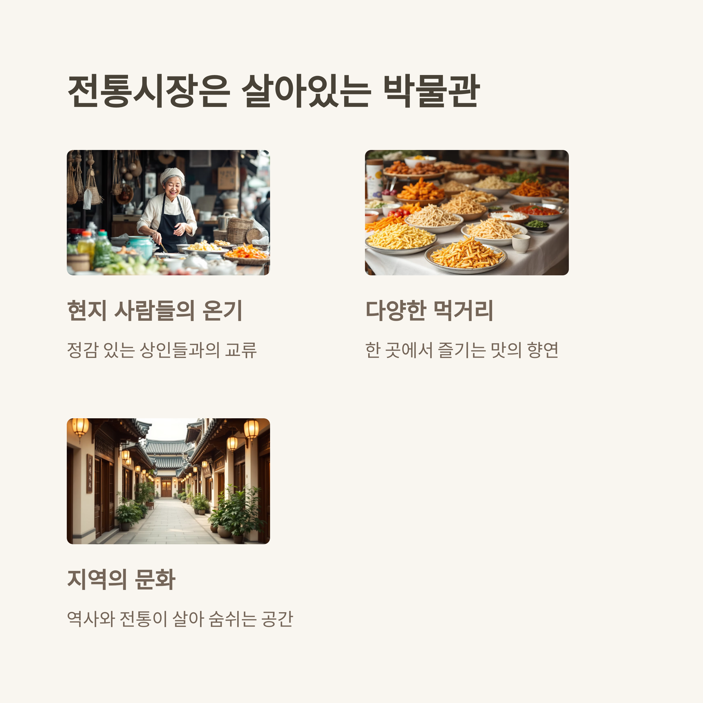 여행의 진짜 묘미는 그 지역만의 색다른 경험에 있다고들 하죠. 그중에서도 전통시장은 오감으로 즐기는 현장감이 가득한 공간입니다. 서울 광장시장의 빈대떡부터 전주 남부시장의 비빔밥, 부산 깡통시장의 씨앗호떡, 대구 서문시장의 찜갈비까지. 한국의 전통시장에는 지역 고유의 맛과 냄새, 그리고 사람들의 따뜻한 정이 함께 담겨 있습니다.