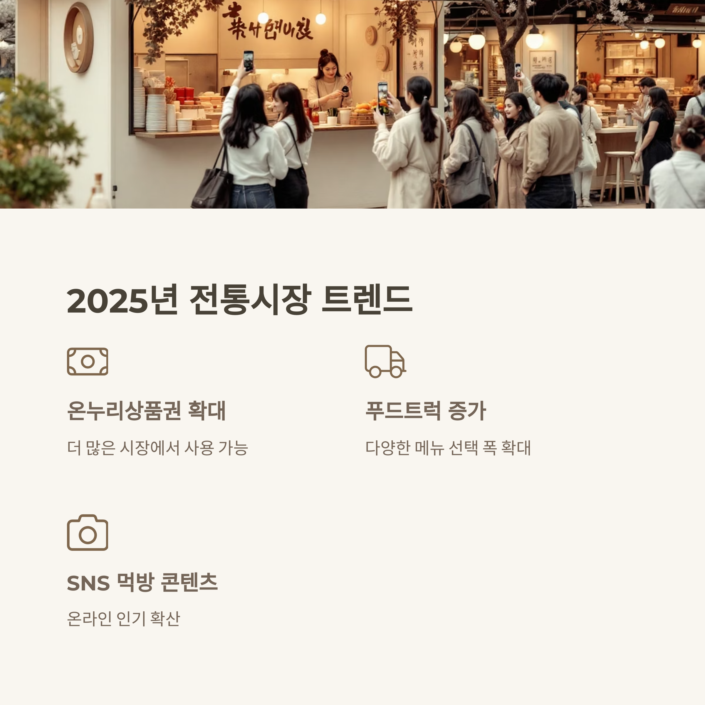 2025년에는 온누리상품권 사용 가능 시장 확대, 푸드트럭 운영 증가, SNS 먹방 콘텐츠 활성화 등이 전통시장 트렌드를 이끌고 있습니다. 특히, 한 곳에서 다양한 메뉴를 맛볼 수 있는 편리함은 전통시장을 찾는 가장 큰 이유 중 하나입니다. 당일치기 여행으로도 충분히 가치 있는 코스를 제공하는 전통시장 여행은, 누구에게나 쉽고 유익한 선택입니다.