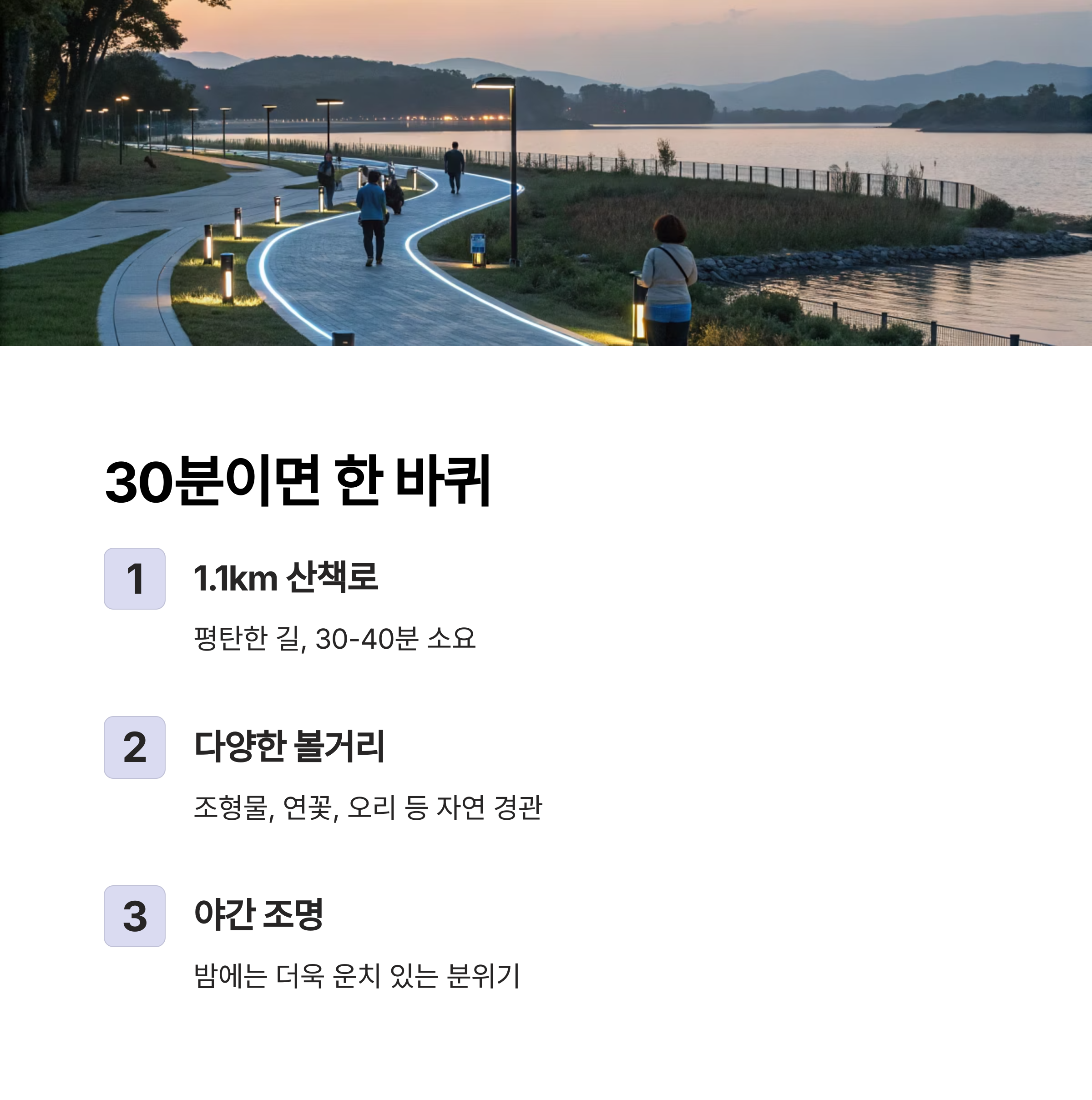 걷기 시작하면 다양한 조형물, 연꽃, 오리 등이 자연스럽게 어우러진 모습을 볼 수 있습니다.