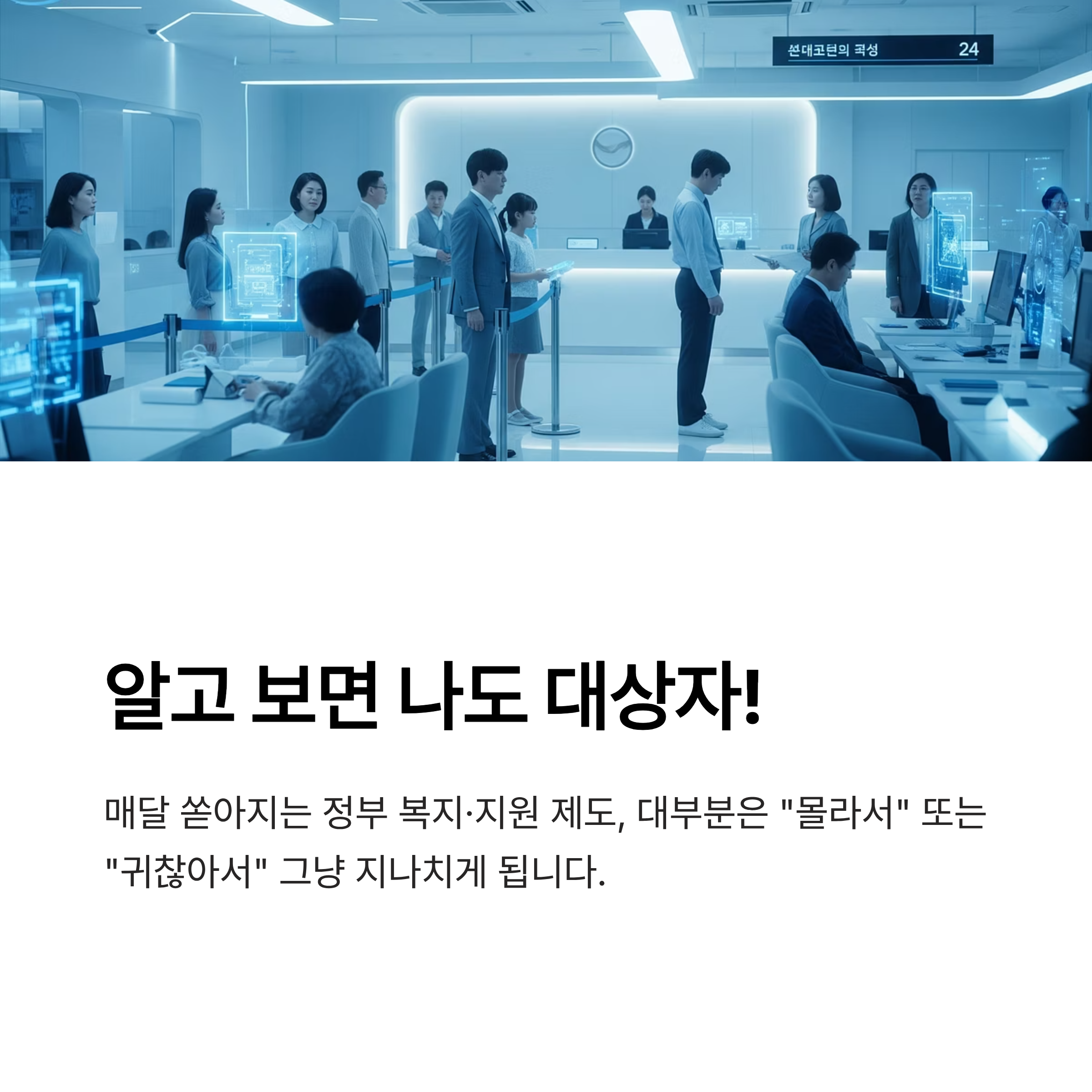 매달 쏟아지는 정부의 복지·지원 제도, 알고 보면 나도 대상자일 수 있습니다.