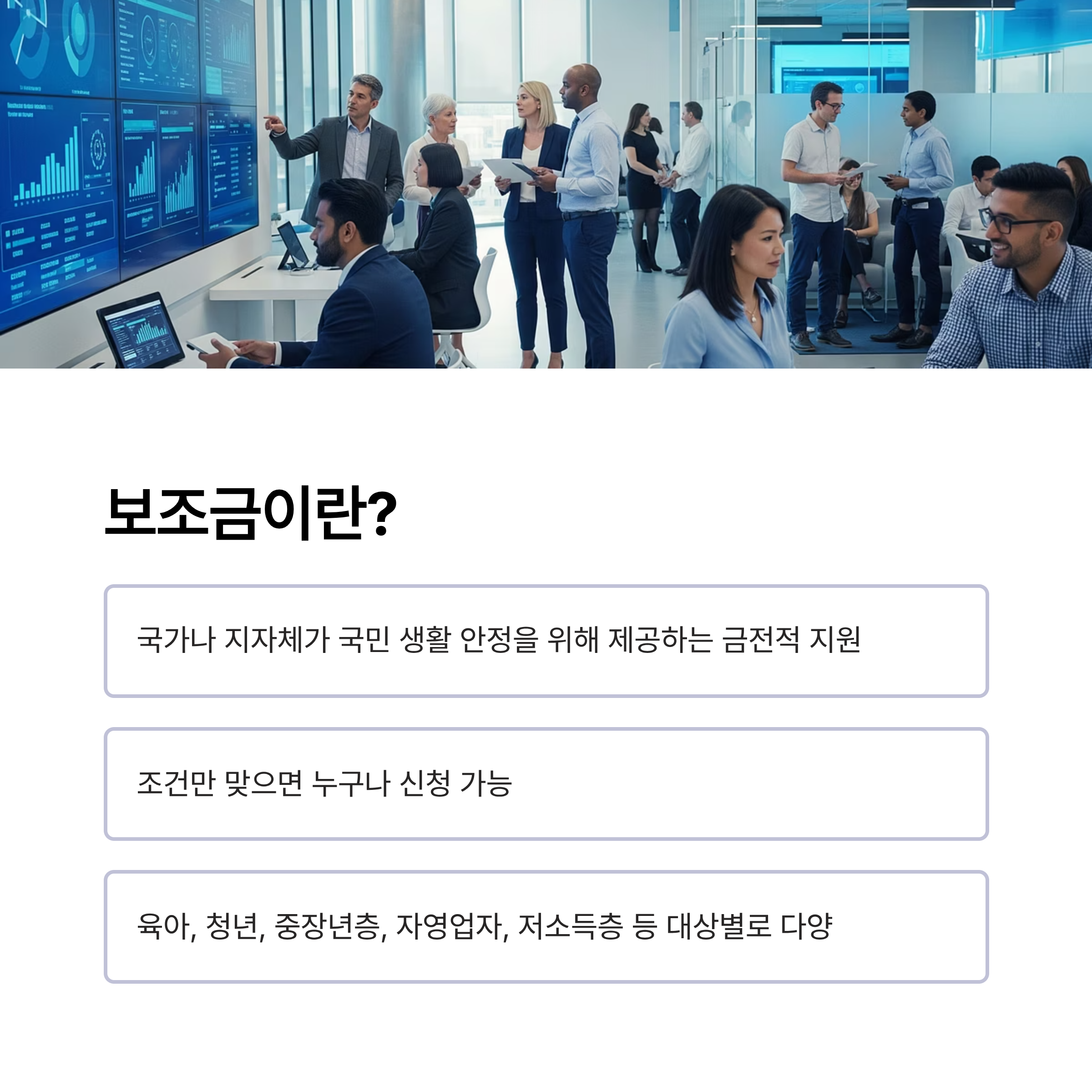 예를 들어, 육아, 청년, 중장년층, 자영업자, 저소득층 등 각 대상별로 받을 수 있는 보조금이 다릅니다.