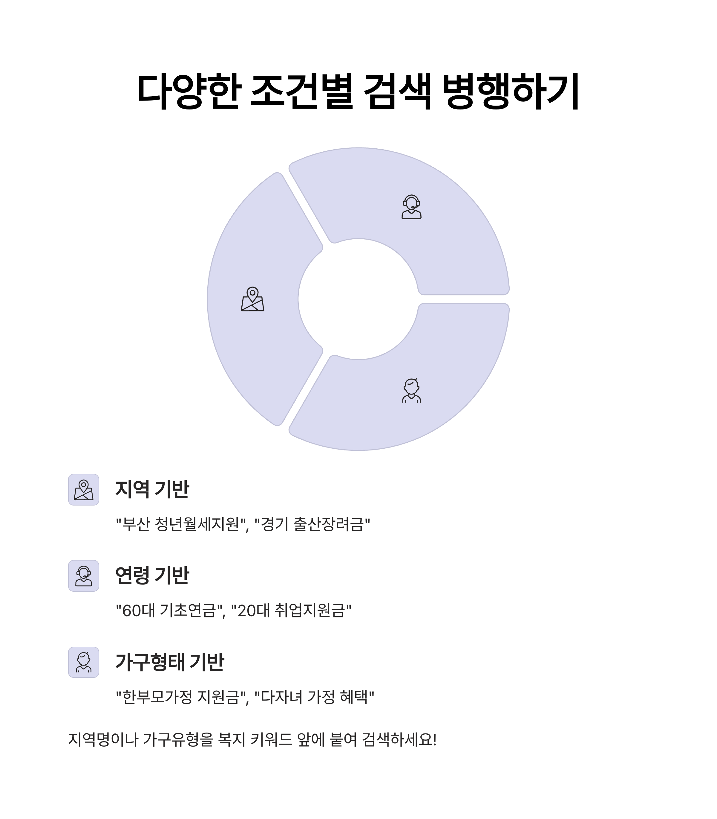 복지 관련 키워드 앞에 ‘지역명’ 또는 ‘가구유형’을 붙여 검색하는 것이
