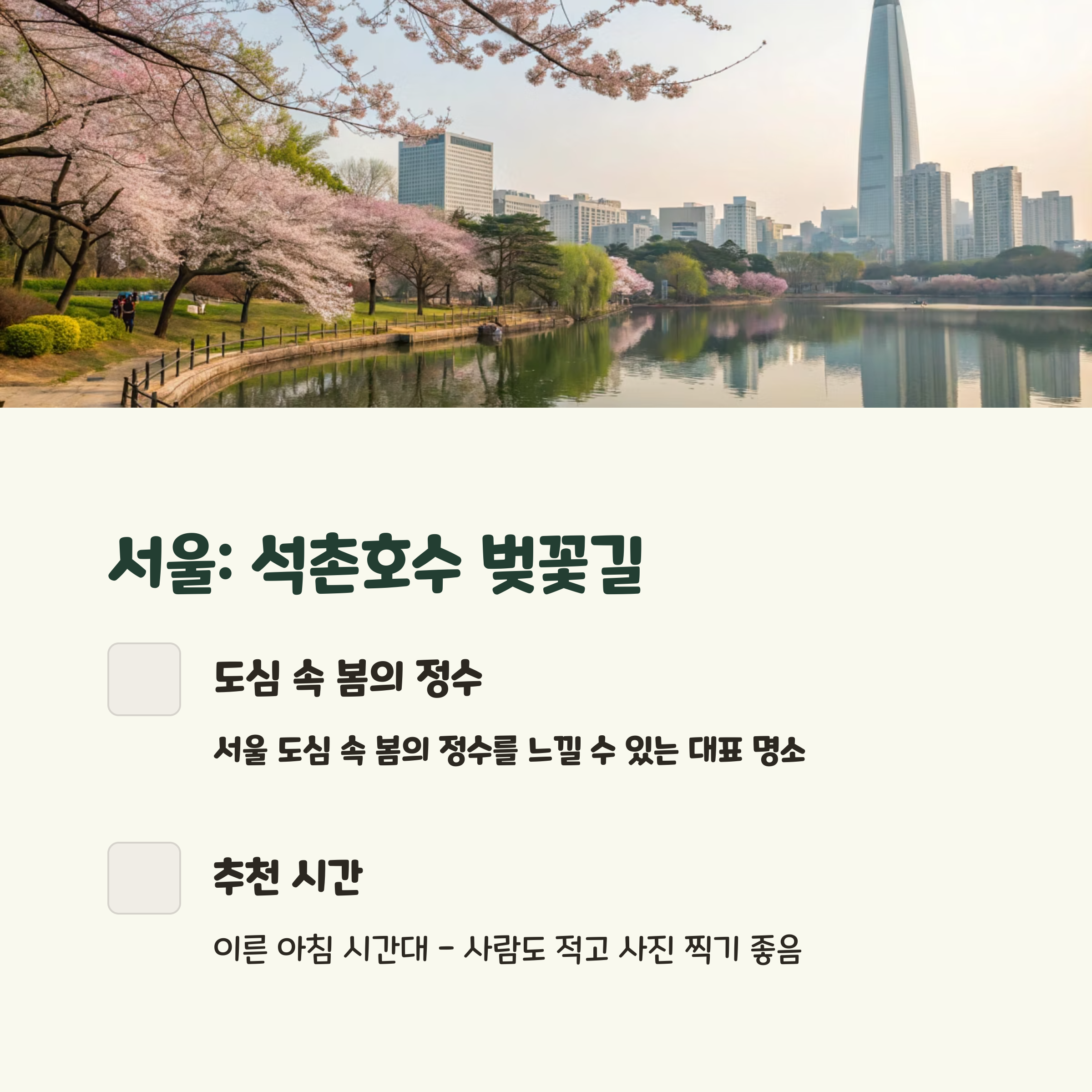 | 서울 석촌호수 | 벚꽃 | 도심 속 조용한 호수길 |