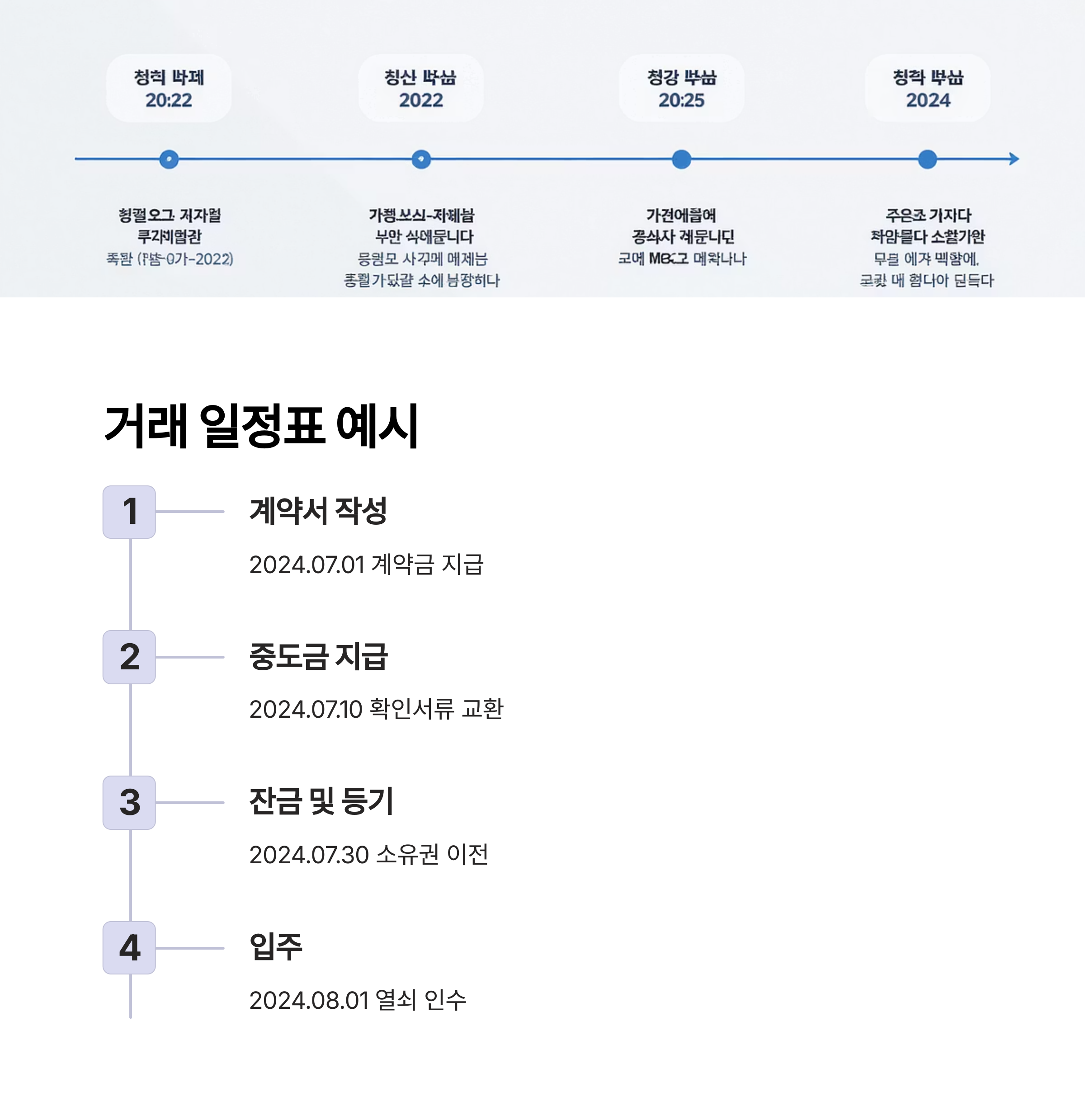 | 계약서 작성 | 2024.07.01 | 매도인/매수인 | 계약금 지급, 인적사항 확인 |