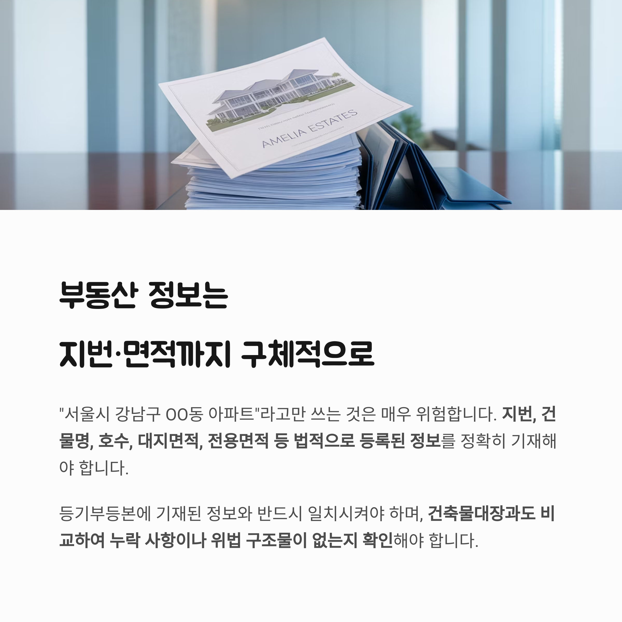 지번, 건물명, 호수, 대지면적, 전용면적 등 법적으로 등록된 정보를 정확히 기재해야 합니다.